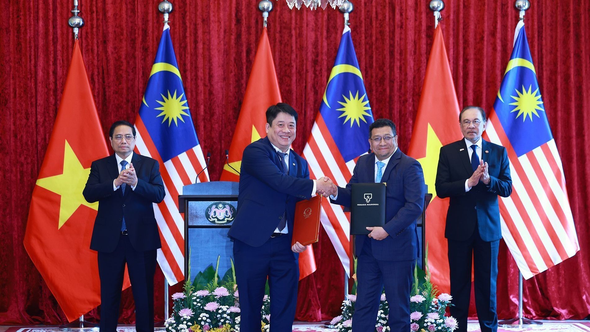 两位总理共同见证越南电力集团与马来西亚电力集团合作备忘录签字仪式。(图片来源:越通社)