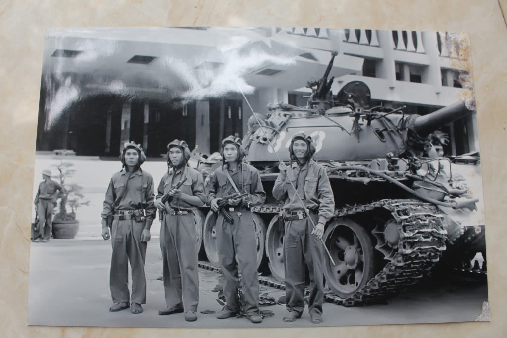 Đại úy Vũ Đăng Toàn (ngoài cùng bên trái) và Đại tá, Anh hùng LLVT nhân dân Bùi Quang Thận, nguyên đại đội trưởng Đại đội 4, Tiểu đoàn tăng 2, Lữ đoàn xe tăng 203 thuộc Quân đoàn 2 (ngoài cùng bên phải) chụp trong ngày chiến thắng 30/4/1975.