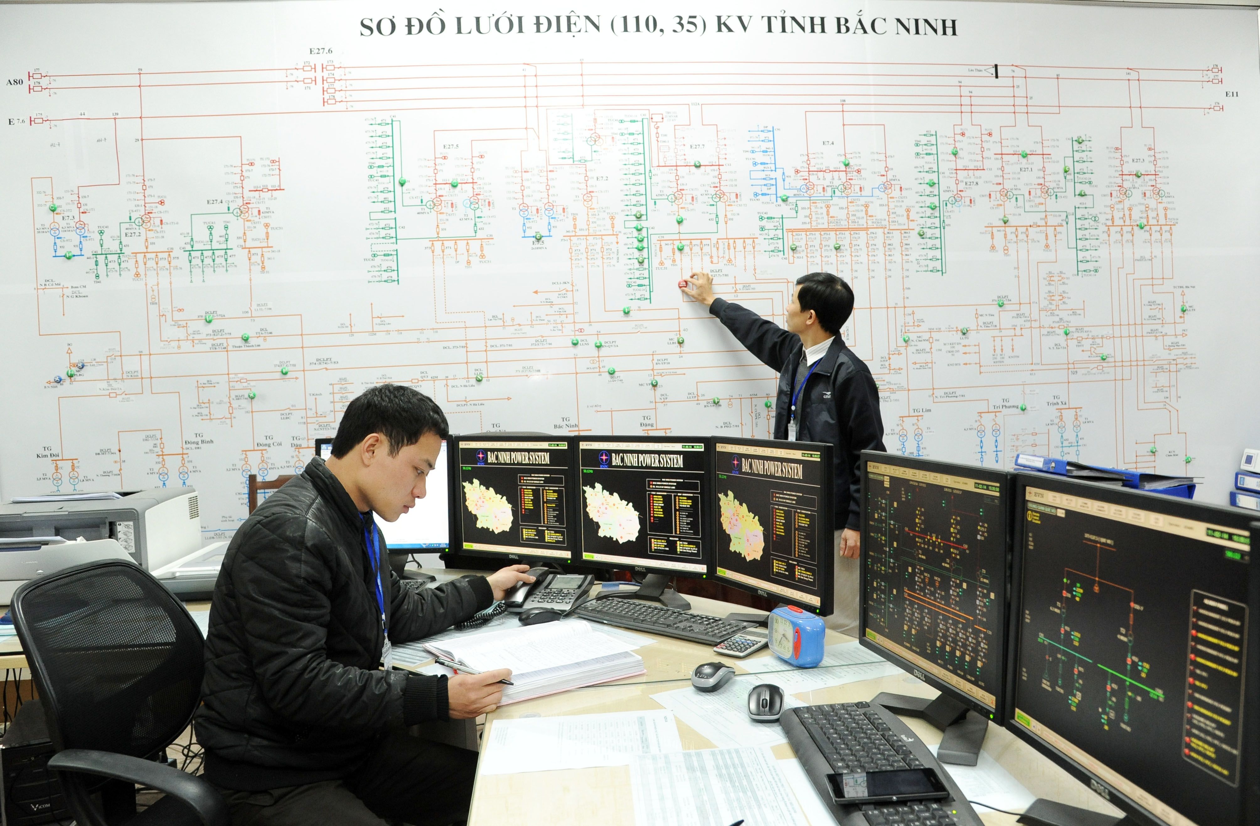 Kỹ sư Công ty Điện lực Bắc Ninh kiểm tra giám sát lưới điện tại phòng điều độ 2.