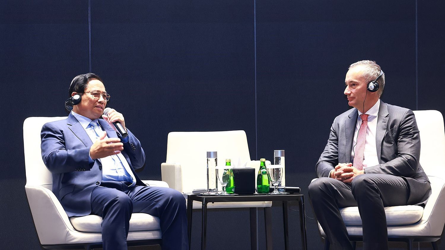 El primer ministro de Vietnam, Pham Minh Chinh, dialoga con titulares y estudiantes de la Academia Diplomática Anwar Gargash. (Foto: VNA)