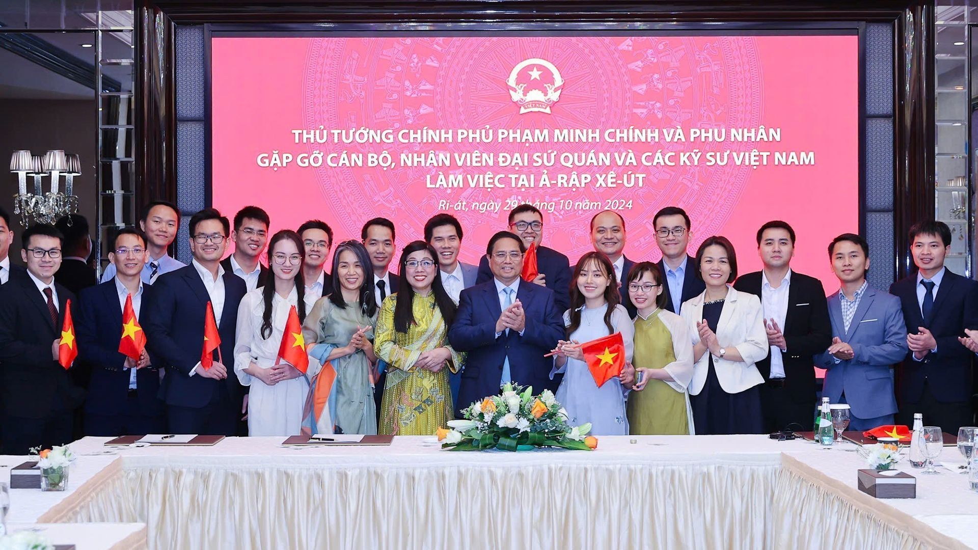 El primer ministro de Vietnam, Pham Minh Chinh, su esposa, y funcionarios de la Embajada e ingenieros vietnamitas que trabajan en Arabia Saudí. (Foto: VNA)