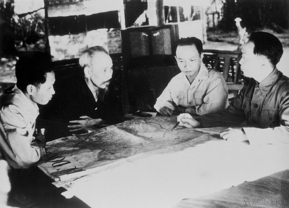 Chủ tịch Hồ Chí Minh, Đại tướng Võ Nguyên Giáp (phải) cùng các đồng chí lãnh đạo Đảng bàn kế hoạch mở Chiến dịch Điện Biên Phủ. (Ảnh: TTXVN)