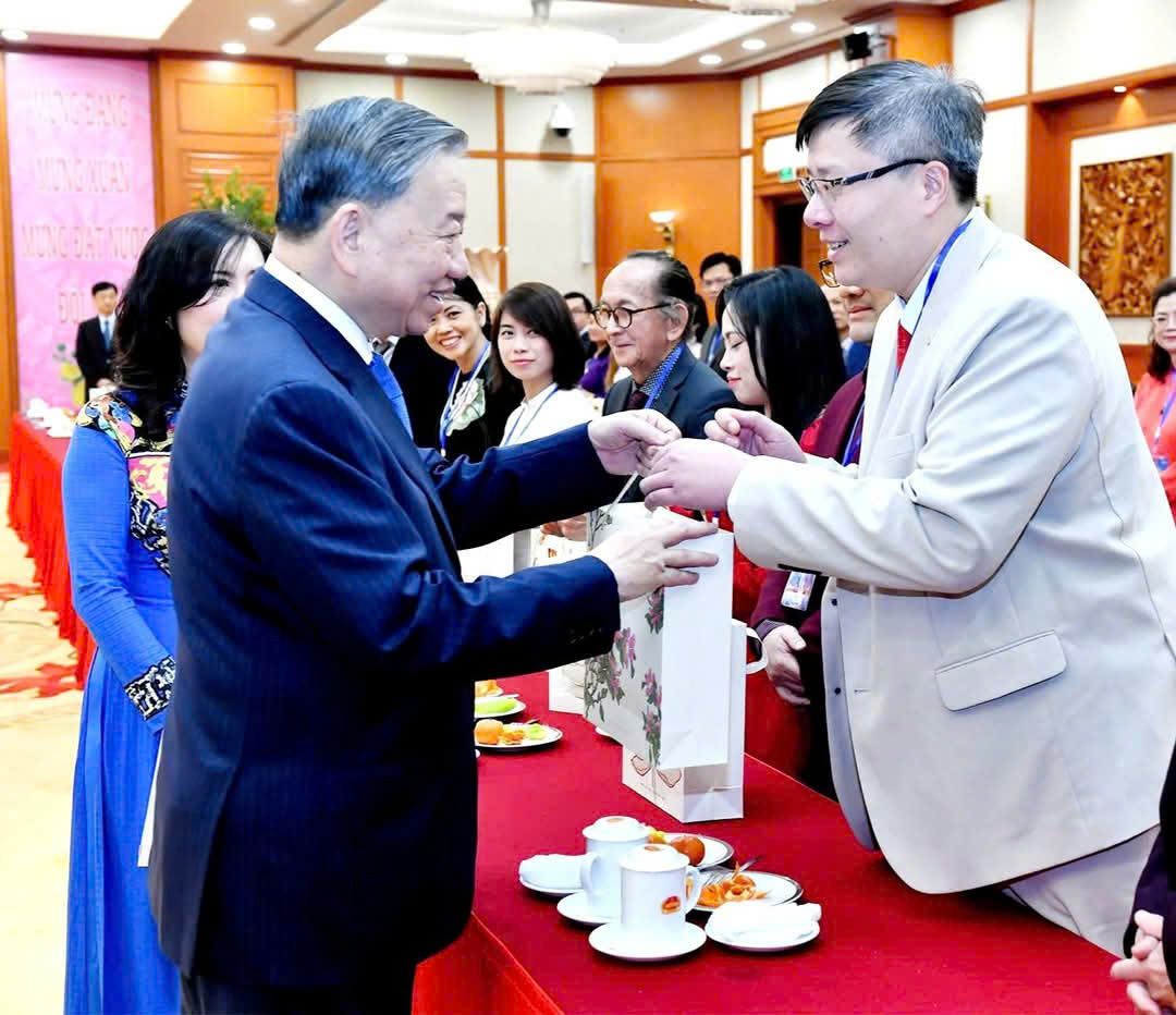 Le Secrétaire général du Parti communiste du Vietnam, To Lam, rencontrant des Vietnamiens de l’étranger exemplaires lors du programme « Printemps au pays natal 2025 ». Photo fournie par l’intéressé.