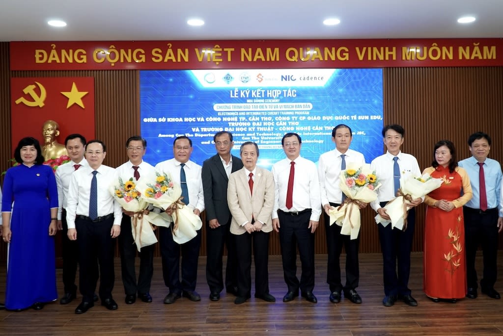 La cérémonie de signature de l’accord de coopération pour la formation de ressources humaines dans le secteur de l’électronique et des semi-conducteurs entre le Département des Sciences et Technologies de Cân Tho, l’École Polytechnique (relevant de l’Université de Cân Tho), l’Université de Technologie et d’Ingénierie de Cân Tho et la Société par actions d’Éducation Internationale SunEdu. Photo : Fournie par la famille