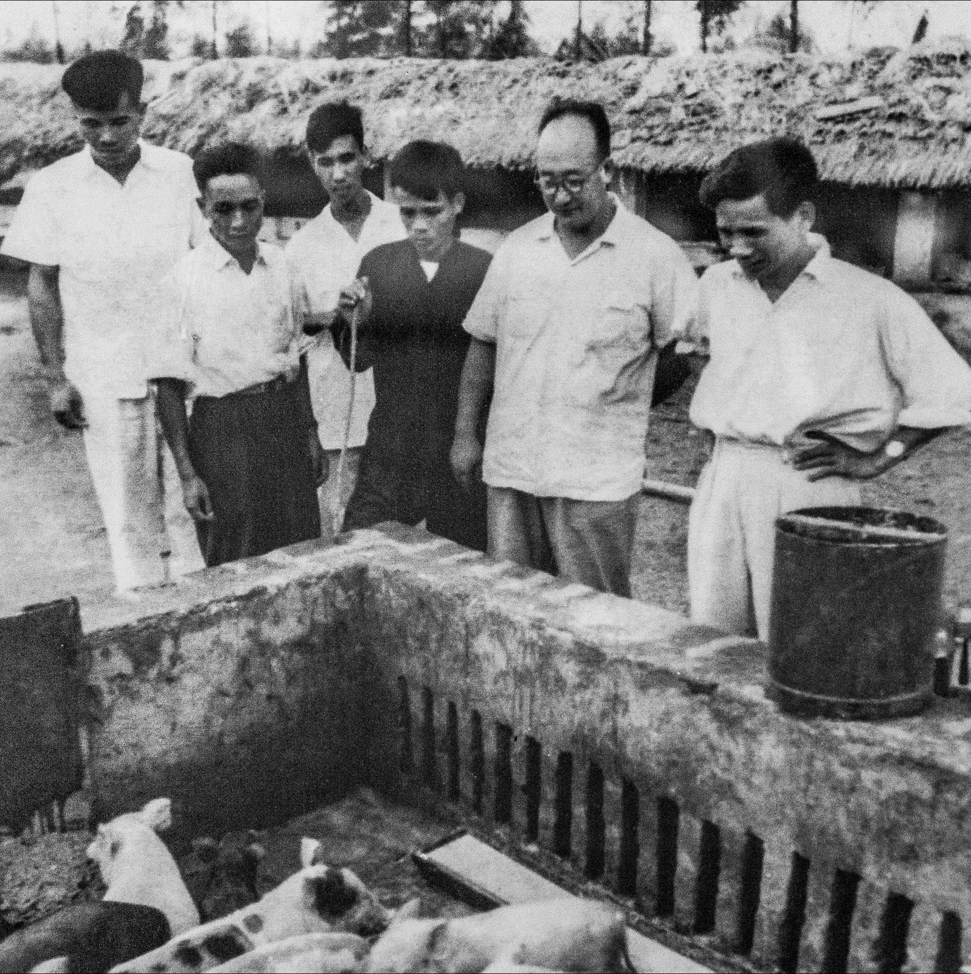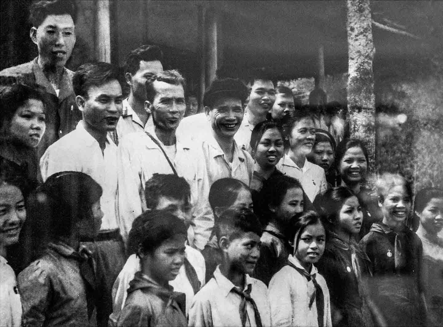 Bí thư Tỉnh ủy Kim Ngọc (người đội mũ) và đồng chí Nguyễn Văn Tôn - Thường vụ Tỉnh ủy chụp ảnh với các đại biểu Thanh thiếu niên xuất sắc trong phong trào "Ba sẵn sàng" toàn tỉnh lần thứ II, năm 1969. (Ảnh: Cổng thông tin điện tử tỉnh Vĩnh Phúc)