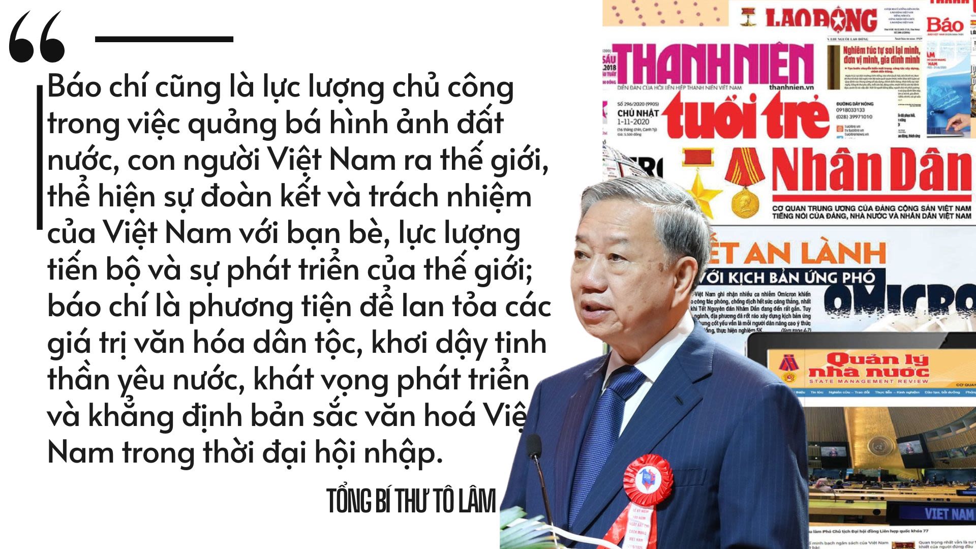 Trong khói lửa chiến tranh, báo chí là vũ khí sắc bén, mạnh hơn các loại đạn bom, xe tăng, đại bác, truyền tải tinh thần kháng chiến, lòng quả cảm và khát vọng độc lập, kêu gọi toàn dân tộc đấu tranh giải phóng và thống nhất non sông. Trong xây dựng, bảo vệ và phát triển đất nước, báo chí là nhịp cầu nối giữa Đảng, Nhà nước với nhân dân, là diễn đàn tin cậy của nhân dân, là sức mạnh, là nguồn cảm hứng cho toàn dân tộc trên con đường hướng tới tương lai giàu mạnh, phồn thịnh, độc lập, tự do, phát triển bền vững.