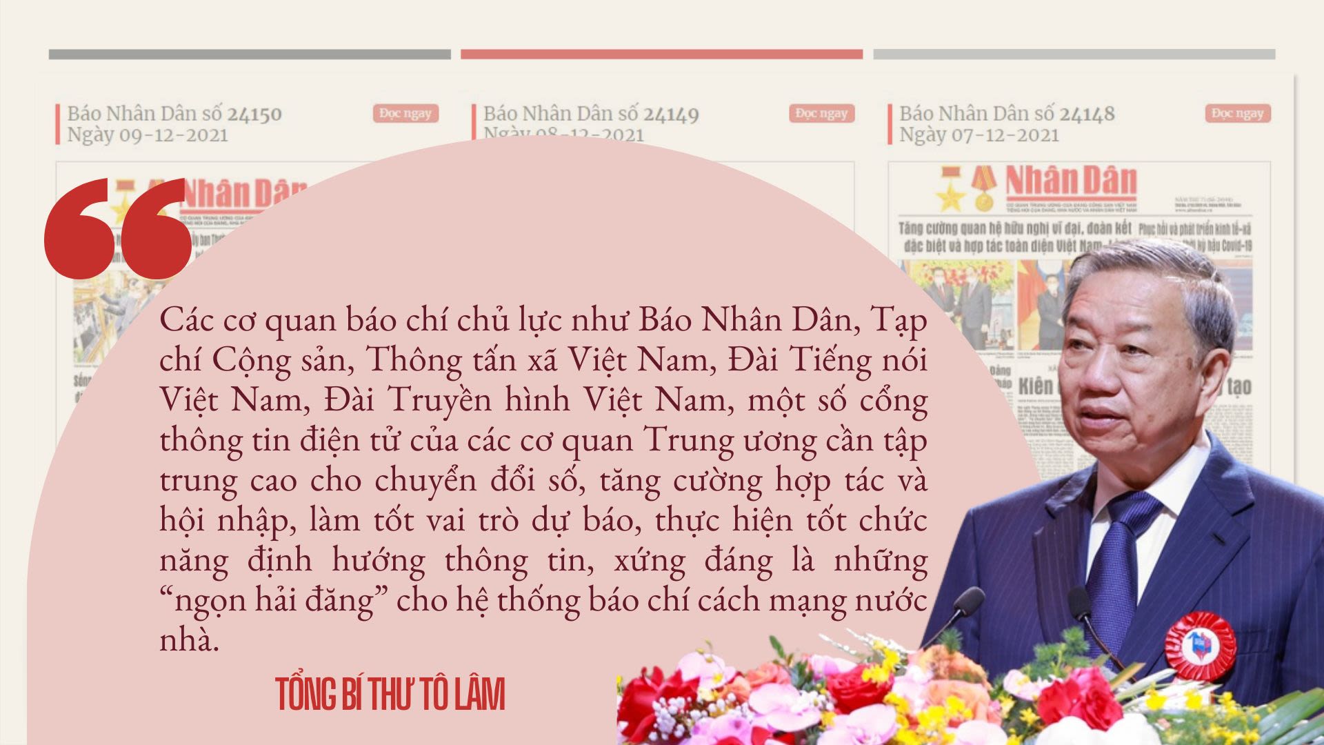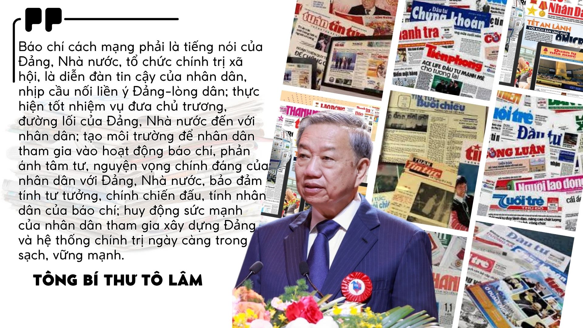 Thứ nhất, trong kỷ nguyên mới của dân tộc Việt Nam, các cơ quan báo chí và đội ngũ những người làm báo cần nhận thức sâu sắc trách nhiệm chính trị-xã hội đặc biệt cao cả của mình trước Đảng, Nhà nước và nhân dân. Báo chí cách mạng phải là tiếng nói của Đảng, Nhà nước, tổ chức chính trị xã hội, là diễn đàn tin cậy của nhân dân, nhịp cầu nối liền ý Đảng-lòng dân; thực hiện tốt nhiệm vụ đưa chủ trương, đường lối của Đảng, Nhà nước đến với nhân dân; tạo môi trường để nhân dân tham gia vào hoạt động báo chí, phản ánh tâm tư, nguyện vọng chính đáng của nhân dân với Đảng, Nhà nước, bảo đảm tính tư tưởng, chính chiến đấu, tính nhân dân của báo chí; huy động sức mạnh của nhân dân tham gia xây dựng Đảng và hệ thống chính trị ngày càng trong sạch, vững mạnh.