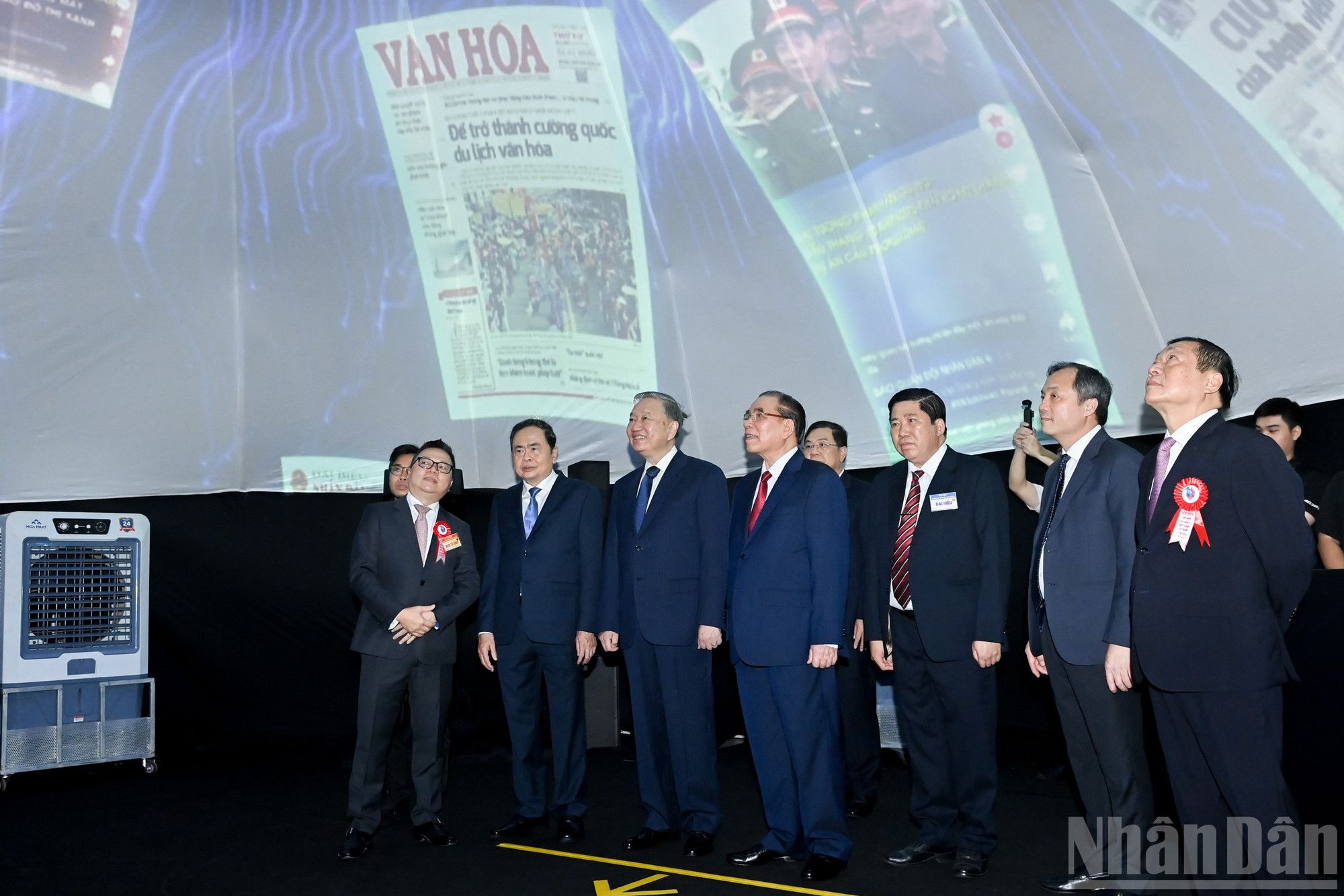 Tổng Bí thư Tô Lâm và các đồng chí lãnh đạo tham quan gian trưng bày những công nghệ mới tại Hội báo.