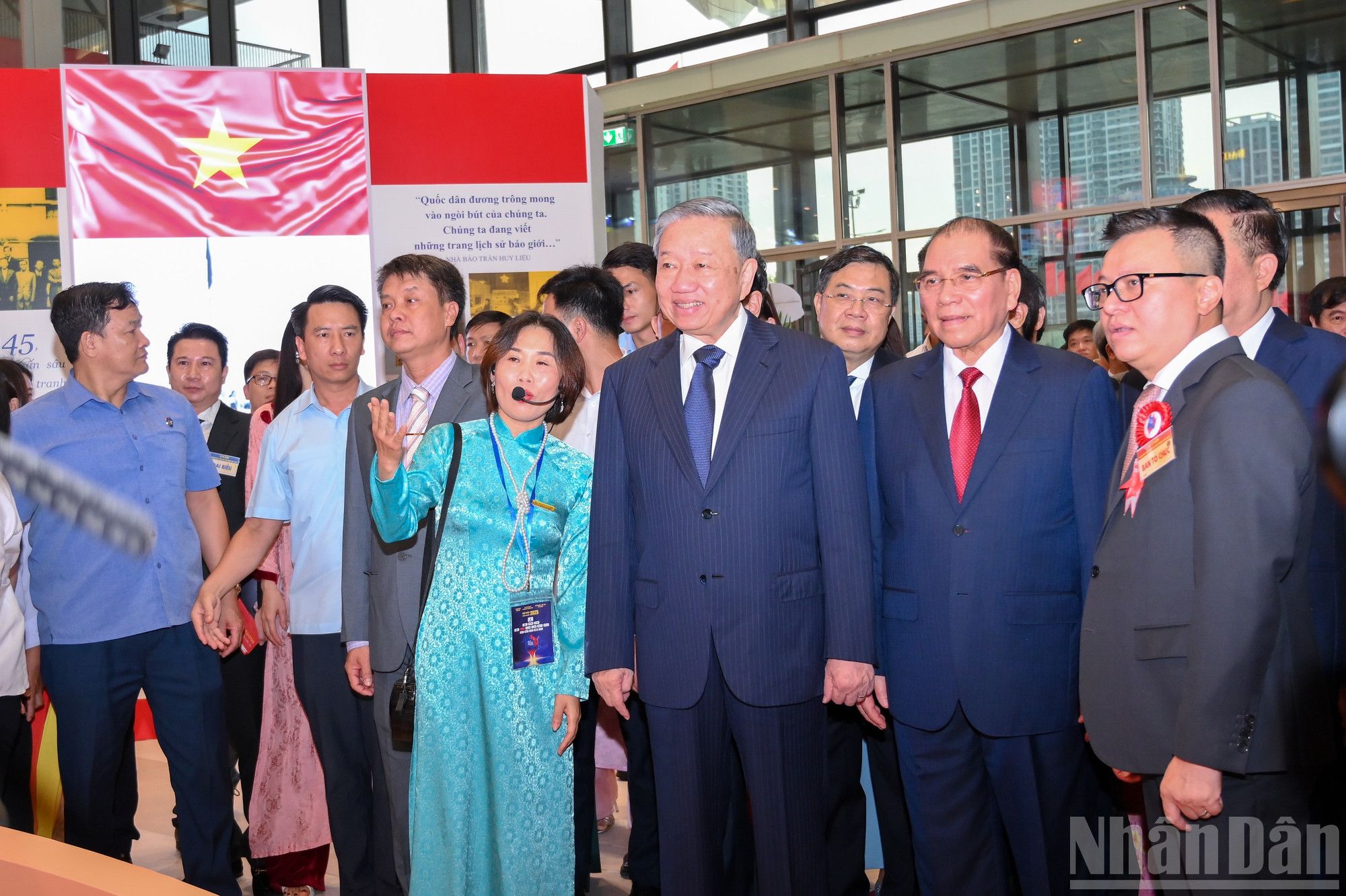Tổng Bí thư Tô Lâm, các đồng chí lãnh đạo Đảng, Nhà nước và các đại biểu tham quan triển lãm ảnh, tư liệu, hiện vật lịch sử về truyền thống 100 năm Ngày Báo chí Cách mạng Việt Nam; thành tựu xu hướng phát triển báo chí trong kỷ nguyên mới; trưng bày các thiết bị, ứng dụng công nghệ báo chí-truyền thông hiện đại.