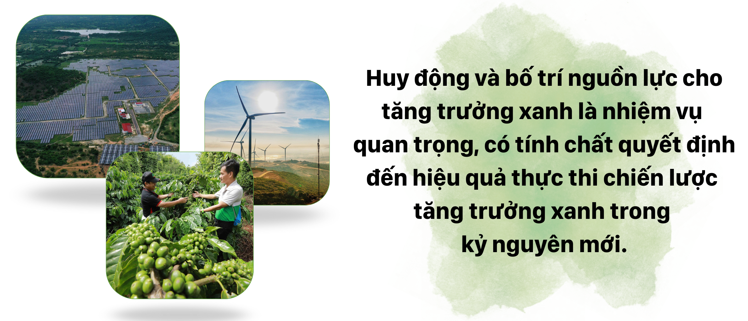 Huy động và bố trí nguồn lực cho tăng trưởng xanh là nhiệm vụ quan trọng, có tính chất quyết định đến hiệu quả thực thi chiến lược tăng trưởng xanh trong kỷ nguyên mới. Cơ cấu nguồn lực cho giai đoạn 2021-2030 được huy động từ ngân sách nhà nước, nguồn tài chính hỗ trợ quốc tế, gồm vốn hỗ trợ phát triển chính thức (ODA), vốn hỗ trợ và vay ưu đãi cho tăng trưởng xanh.