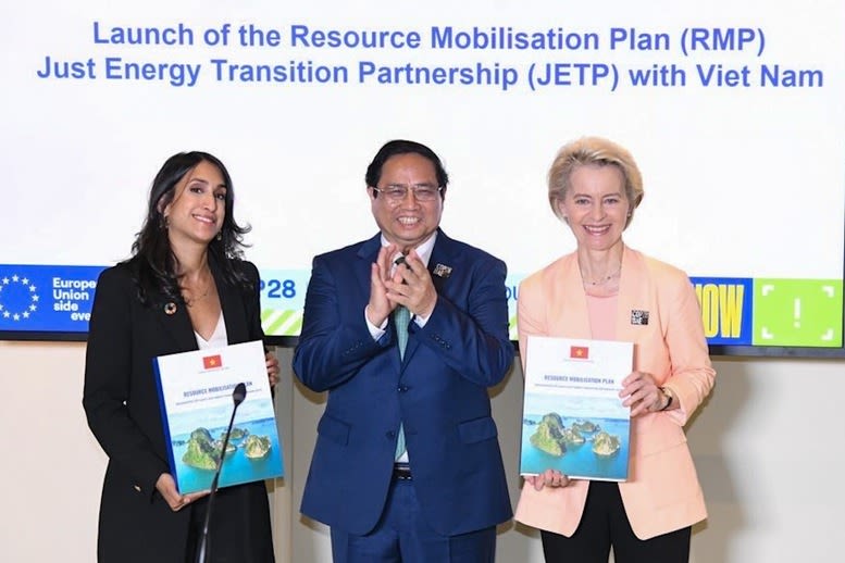 Trong khuôn khổ COP28, Thủ tướng Phạm Minh Chính đã công bố Kế hoạch huy động nguồn lực thực hiện Tuyên bố chính trị thiết lập quan hệ đối tác chuyển đổi năng lượng công bằng (JETP) giữa Việt Nam và Nhóm các Đối tác quốc tế (IPG). Theo đó, các đối tác cam kết huy động nguồn lực ban đầu 15,5 tỷ USD trong vòng 3 đến 5 năm tới để giải quyết nhu cầu cấp bách, mang tính xúc tác cho chuyển đổi năng lượng công bằng của Việt Nam. (Ảnh: VGP)