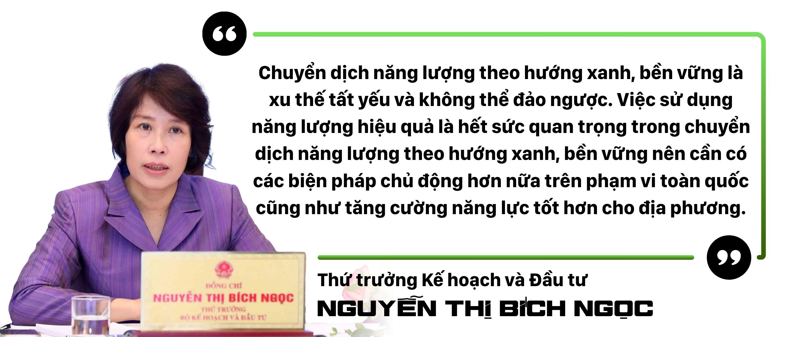 Nêu những vấn đề then chốt để chuyển dịch năng lượng theo hướng tăng trưởng xanh, tiến tới hiện thực hóa khát vọng tăng trưởng xanh của nền kinh tế, Thứ trưởng Kế hoạch và Ðầu tư Nguyễn Thị Bích Ngọc nhấn mạnh: Chuyển dịch năng lượng theo hướng xanh, bền vững là xu thế tất yếu và không thể đảo ngược. Việc sử dụng năng lượng hiệu quả là hết sức quan trọng trong chuyển dịch năng lượng theo hướng xanh, bền vững nên cần có các biện pháp chủ động hơn nữa trên phạm vi toàn quốc cũng như tăng cường năng lực tốt hơn cho địa phương.