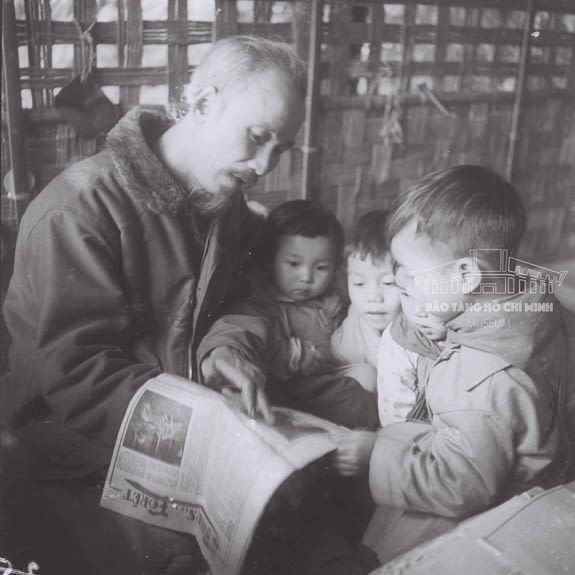 Bác Hồ đọc báo cho các cháu thiếu nhi nghe tại trại nhi đồng ở Việt Bắc, năm 1950. (Ảnh tư liệu: Bảo tàng Hồ Chí Minh)