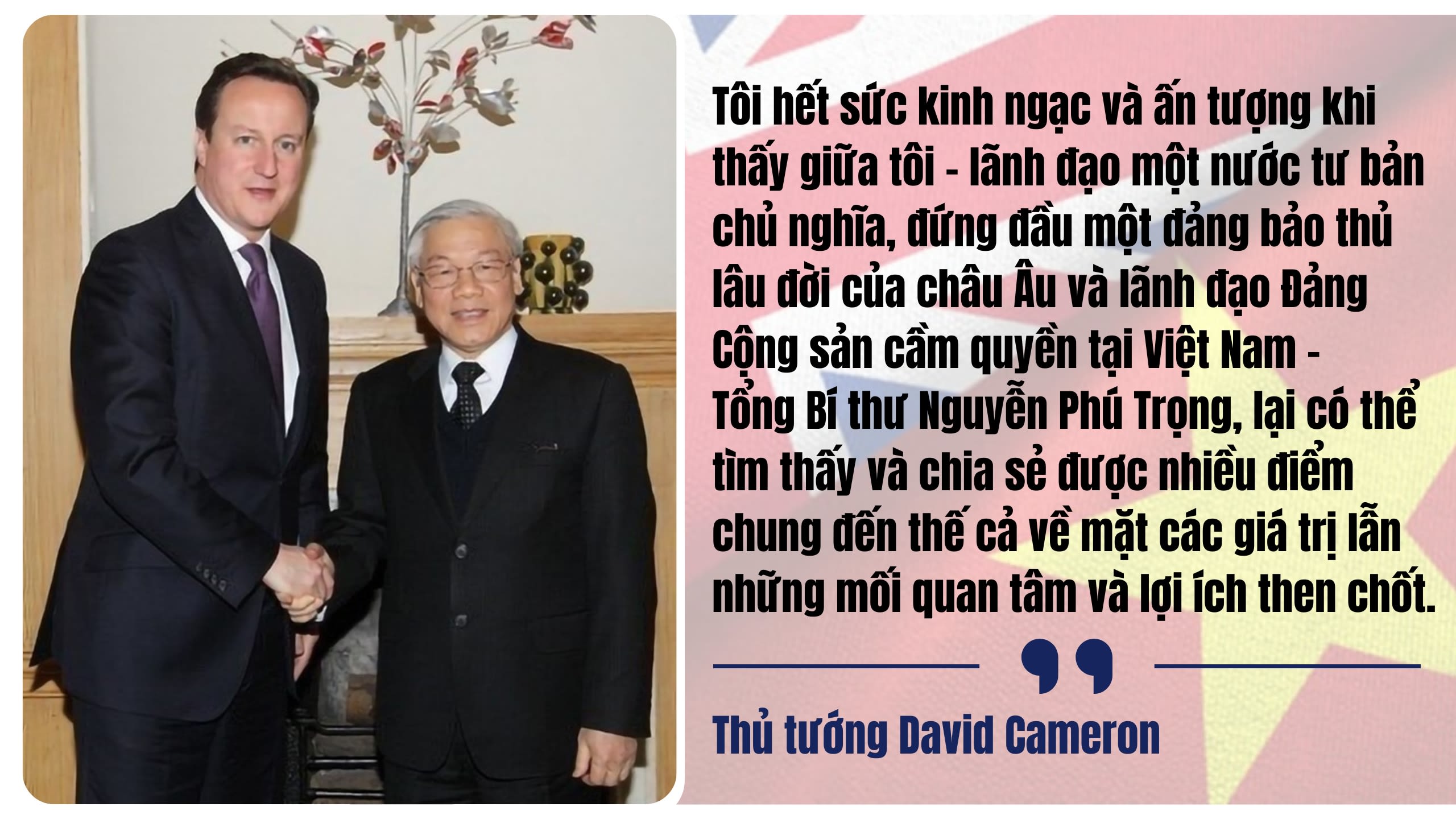Trong chuyến thăm chính thức Vương quốc Anh, Thủ tướng David Cameron chia sẻ với Hoàng gia Anh và Ngoại giao Đoàn về cuộc gặp và hội đàm với Tổng Bí thư Nguyễn Phú Trọng: “Tôi hết sức kinh ngạc và ấn tượng khi thấy giữa tôi - lãnh đạo một nước tư bản chủ nghĩa, đứng đầu một đảng bảo thủ lâu đời của châu Âu và lãnh đạo Đảng Cộng sản cầm quyền tại Việt Nam - Tổng Bí thư Nguyễn Phú Trọng, lại có thể tìm thấy và chia sẻ được nhiều điểm chung đến thế cả về mặt các giá trị lẫn những mối quan tâm và lợi ích then chốt”.