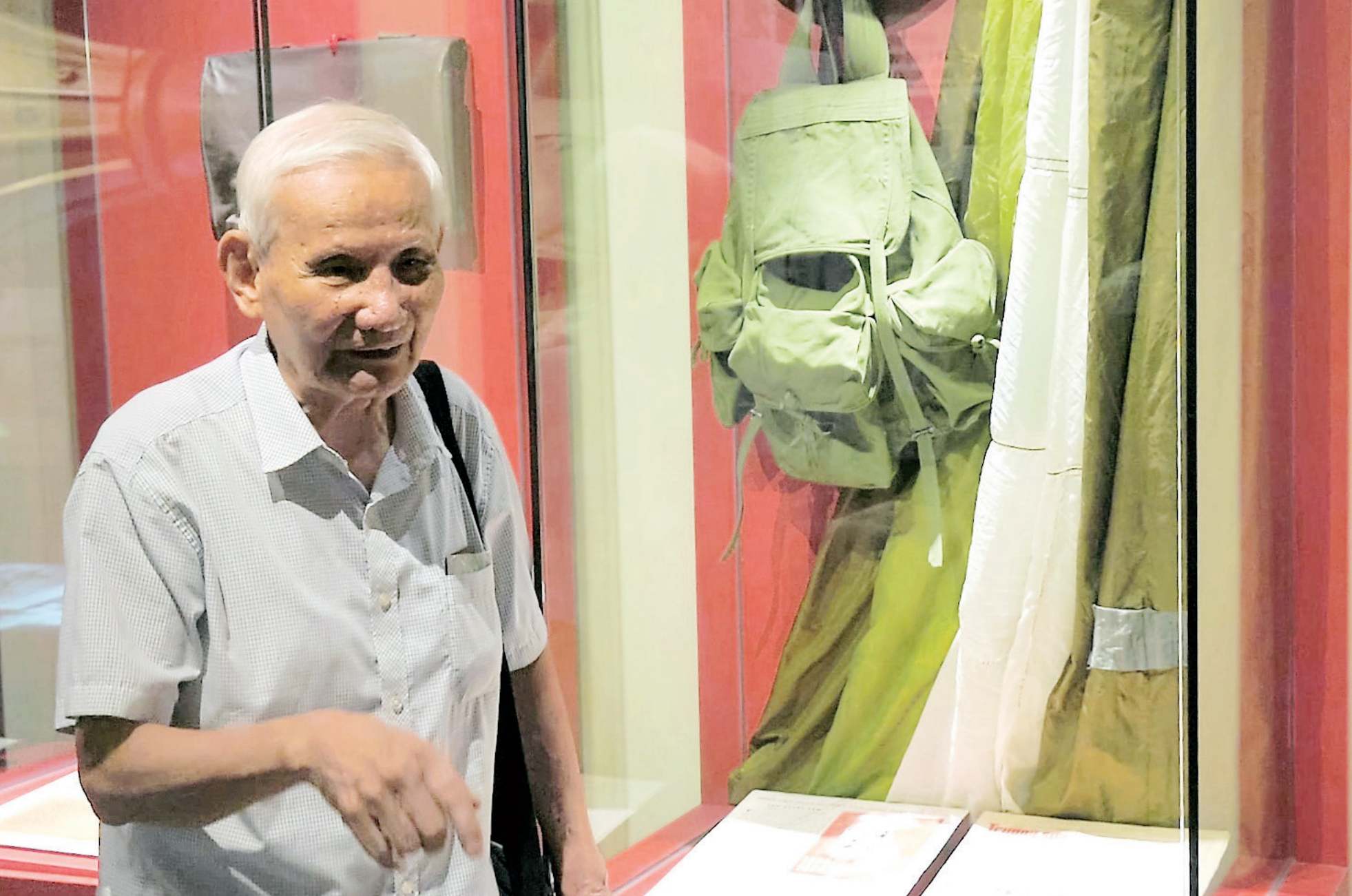 Nhà báo Đặng Minh Phương nguyên Tổng Biên tập Báo Cờ Giải phóng bên kỷ vật chiếc võng dù.