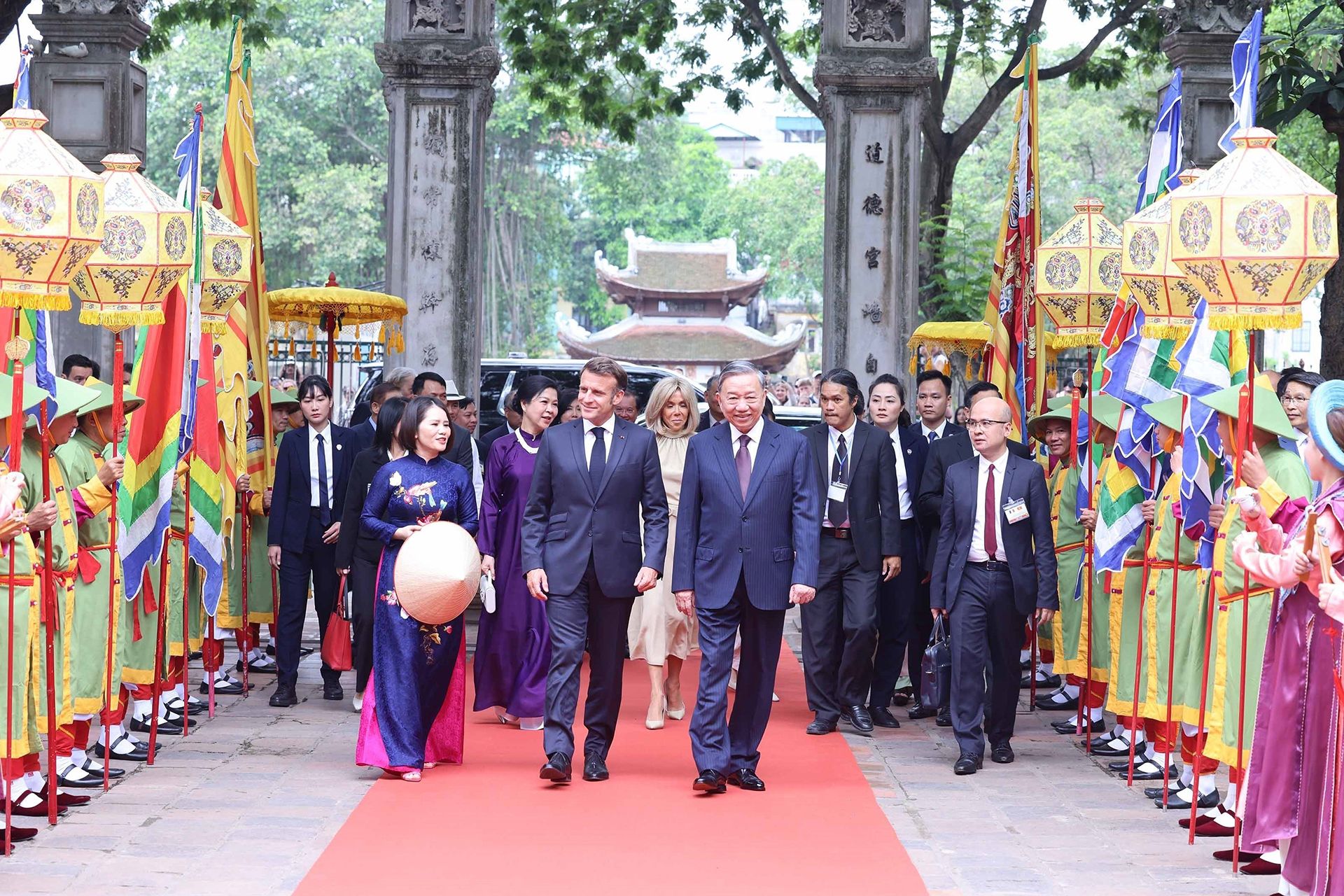 Dans le cadre de sa visite d'État au Vietnam, le président français Emmanuel Macron et son épouse Brigitte Macron, accompagnés du secrétaire général du Parti communiste du Vietnam To Lam et de son épouse, Ngo Phuong Ly, visitent le Temple de la Littérature-Quoc Tu Giam, la première université du Vietnam, le 26 mai 2025. Photo : VNA.
