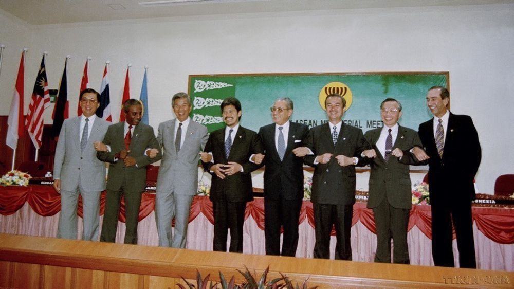 Le ministre vietnamien des Affaires étrangères, Nguyen Manh Cam (2ᵉ, à droite), le Secrétaire général de l’ASEAN et les ministres des Affaires étrangères de l’ASEAN lors de la réunion marquant l’adhésion officielle du Vietnam en tant que 7ᵉ membre de l’ASEAN, le 28 juillet 1995, à Brunei. Photo : VNA.
