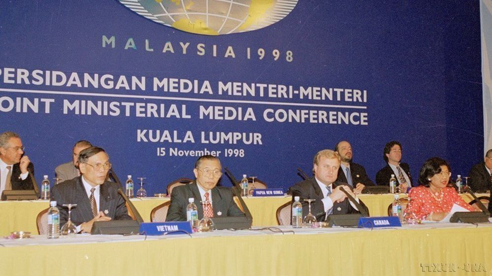 Le vice-Premier ministre, ministre vietnamien des Affaires étrangères Nguyen Manh Cam (2ᵉ, à gauche) et le ministre du Commerce Truong Dinh Tuyen (tout à gauche) lors de la conférence de presse après la séance d’ouverture du 6ᵉ Sommet de l’APEC à Kuala Lumpur, le 15 novembre 1998. Photo : VNA.