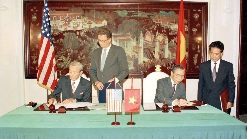 Le 5 août 1995, à Hanoï, le ministre vietnamien des Affaires étrangères Nguyen Manh Cam et le secrétaire d’État américain aux Affaires étrangères Warren Christopher concluent le protocole établissant officiellement les relations diplomatiques entre le Vietnam et les États-Unis. Photo : VNA.