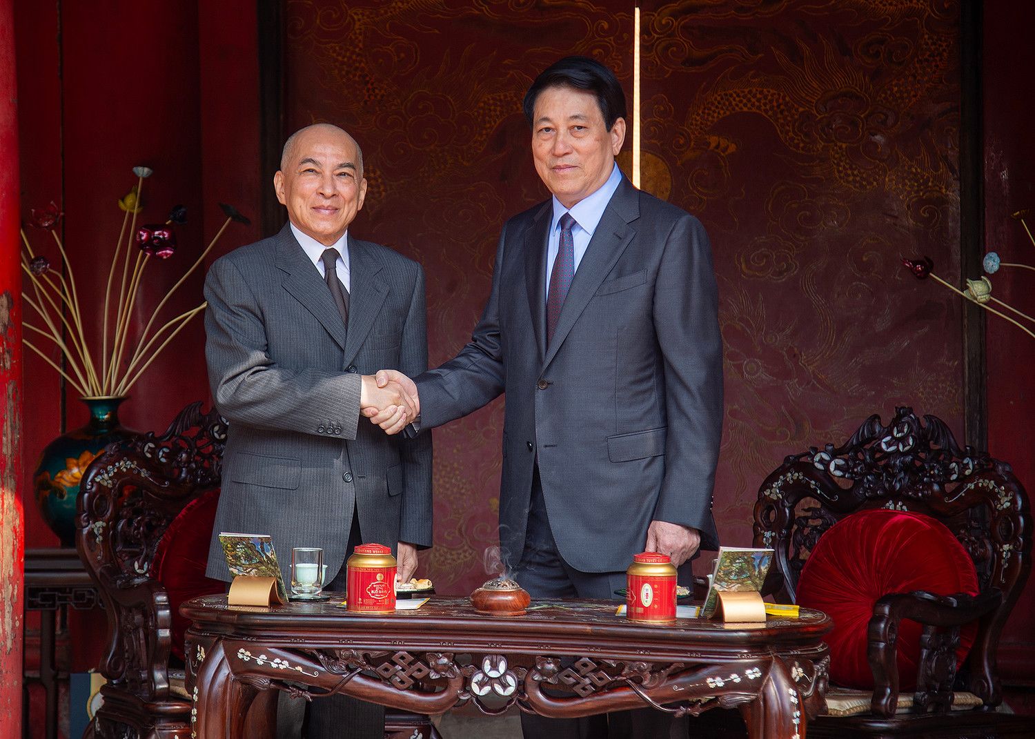 Chủ tịch nước Lương Cường và Quốc vương Campuchia Norodom Sihamoni đến tham quan Di tích Quốc gia đặc biệt Văn Miếu-Quốc Tử Giám và thưởng thức các loại trà quý của Việt Nam, trong khuôn khổ chuyến thăm cấp Nhà nước tới Việt Nam, ngày 29/11/2024. (Ảnh: Nhandan.vn)