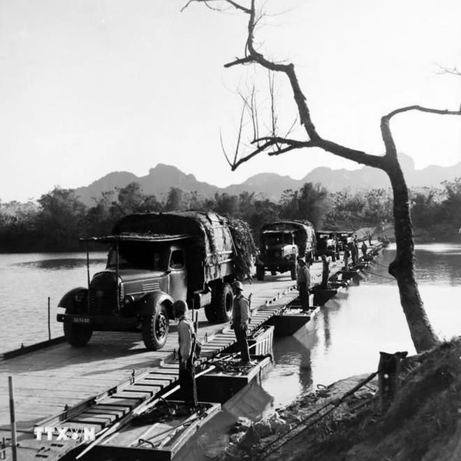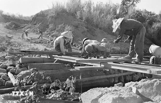 La unidad X Quang Binh, de la Región Militar 3 construye un puente para que las tropas cruzaran el río. Gracias a la ruta de Truong Son, el ejército vietnamita pudo llevar a cabo marchas a gran escala y transportar grandes cantidades de armas y equipos para apoyar el campo de batalla del Sur. (Foto: Vu Ba/VNA)
