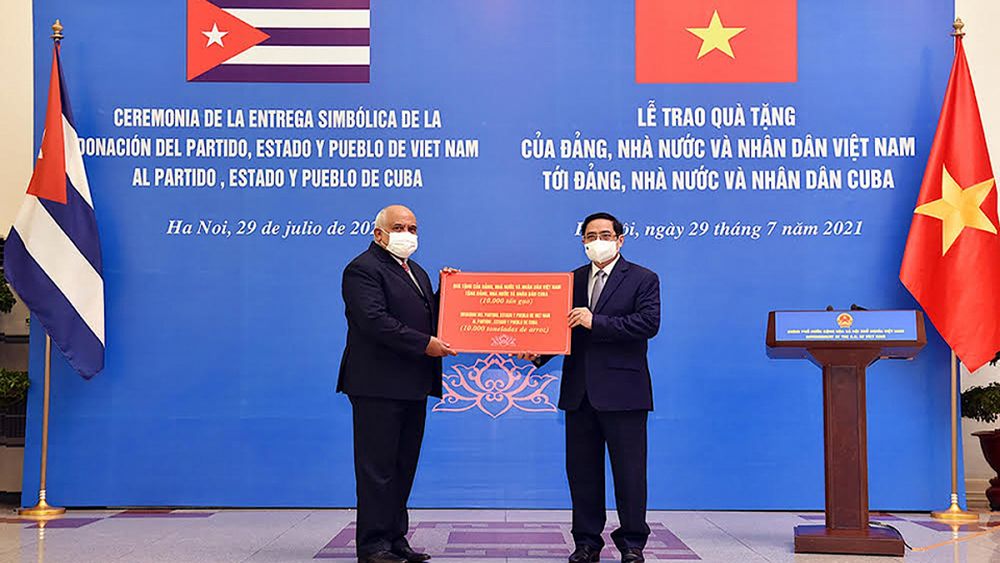 Thủ tướng Chính phủ Phạm Minh Chính trao tượng trưng món quà 10.000 tấn gạo tặng Đảng, Nhà nước và Nhân dân Cuba, ngày 29/7/2021. (Ảnh: TTXVN)