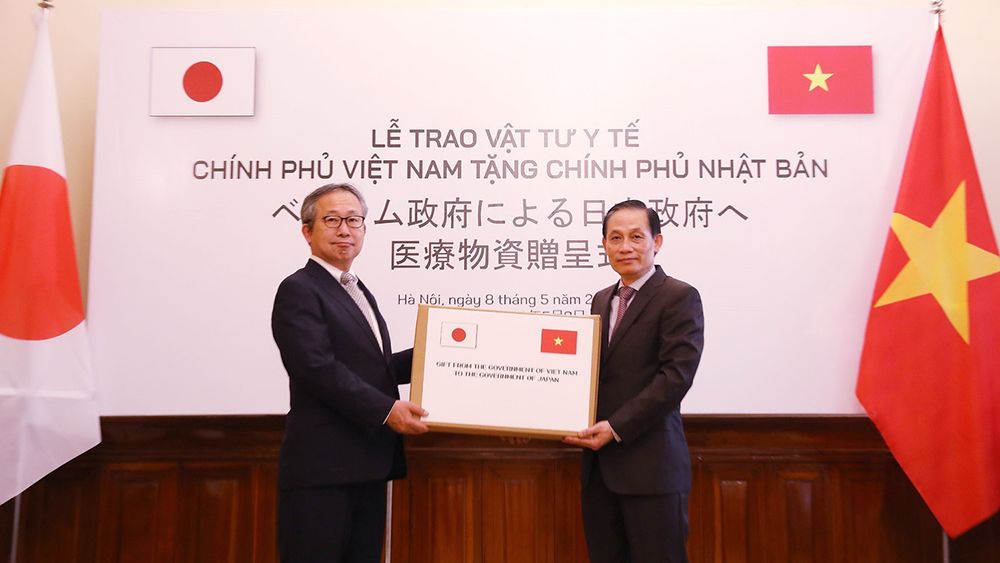 Thứ trưởng Ngoại giao Lê Hoài Trung trao Đại sứ Nhật Bản tại Việt Nam Yamada Takio tượng trưng vật tư y tế của Chính phủ Việt Nam hỗ trợ Chính phủ và nhân dân Nhật Bản phòng, chống dịch Covid-19, ngày 8/5/2020. (Ảnh: TTXVN)