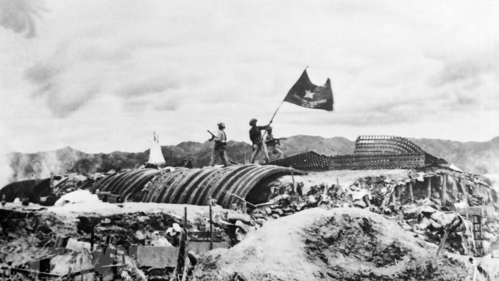 Chiều 7/5/1954, lá cờ Quyết chiến-Quyết thắng của Quân đội nhân dân Việt Nam tung bay trên nóc hầm tướng De Castries. Chiến dịch lịch sử Điện Biên Phủ toàn thắng. (Ảnh: TTXVN)