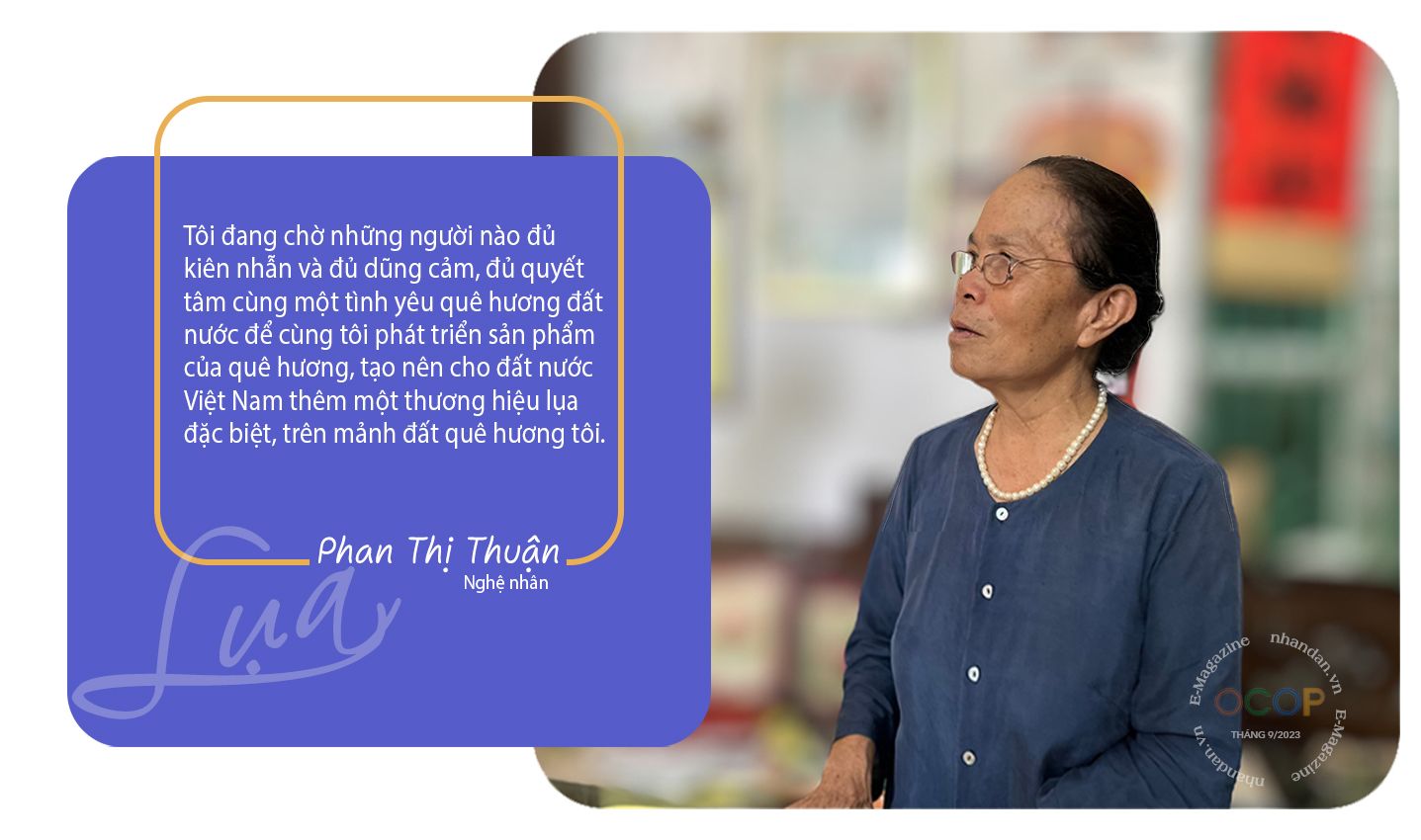 Ở tuổi 70, bà Thuận tự nhận mình đã thật sự già, không biết còn đi tiếp hành trình này bao lâu nữa. Trong những nỗ lực duy trì nghề của cha ông, bà đau đáu nỗi lo khi nhiều người vẫn nghĩ đến làm máy công nghiệp, đến việc nhập nguyên liệu từ nước ngoài về để sản xuất mà không nghĩ phải làm thế nào để xây dựng vùng nguyên liệu trên mảnh đất quê hương vốn rất giàu tiềm năng, hay làm thế nào tạo sinh kế cho chính những con người Việt Nam đầy khéo léo và cần cù.