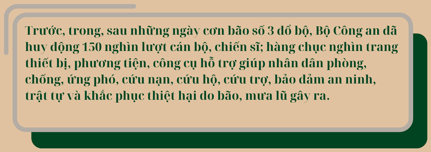 Trước, trong, sau những ngày cơn bão số 3 đổ bộ, Bộ Công an đã huy động 150 nghìn lượt cán bộ, chiến sĩ; hàng chục nghìn trang thiết bị, phương tiện, công cụ hỗ trợ giúp nhân dân phòng, chống, ứng phó, cứu nạn, cứu hộ, cứu trợ, bảo đảm an ninh, trật tự và khắc phục thiệt hại do bão, mưa lũ gây ra.