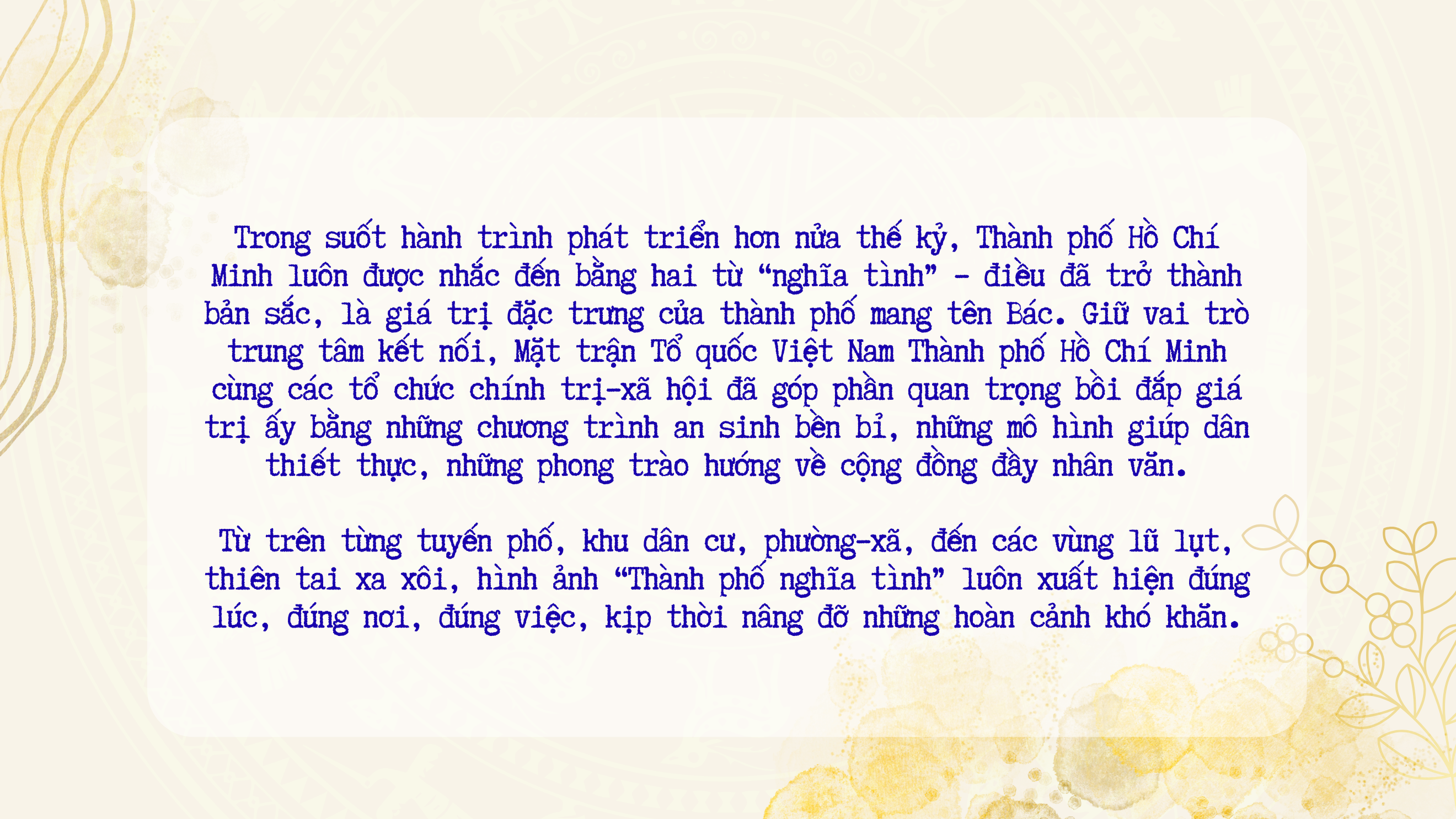 Đó cũng chính là sức mạnh tinh thần giúp Thành phố luôn vững vàng trước mọi biến động, từ thiên tai, dịch bệnh đến thách thức xã hội. Truyền thống ấy sẽ tiếp tục được gìn giữ, lan tỏa mạnh mẽ hơn trong nhiệm kỳ mới, để Thành phố Hồ Chí Minh xứng đáng là trung tâm nghĩa tình của cả nước, là điểm tựa của những hoàn cảnh khó khăn, và là nơi kết nối sức mạnh đại đoàn kết toàn dân tộc.