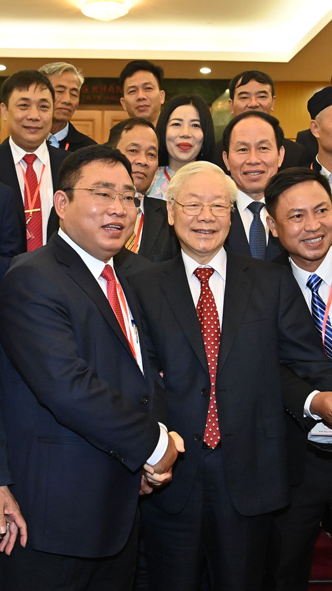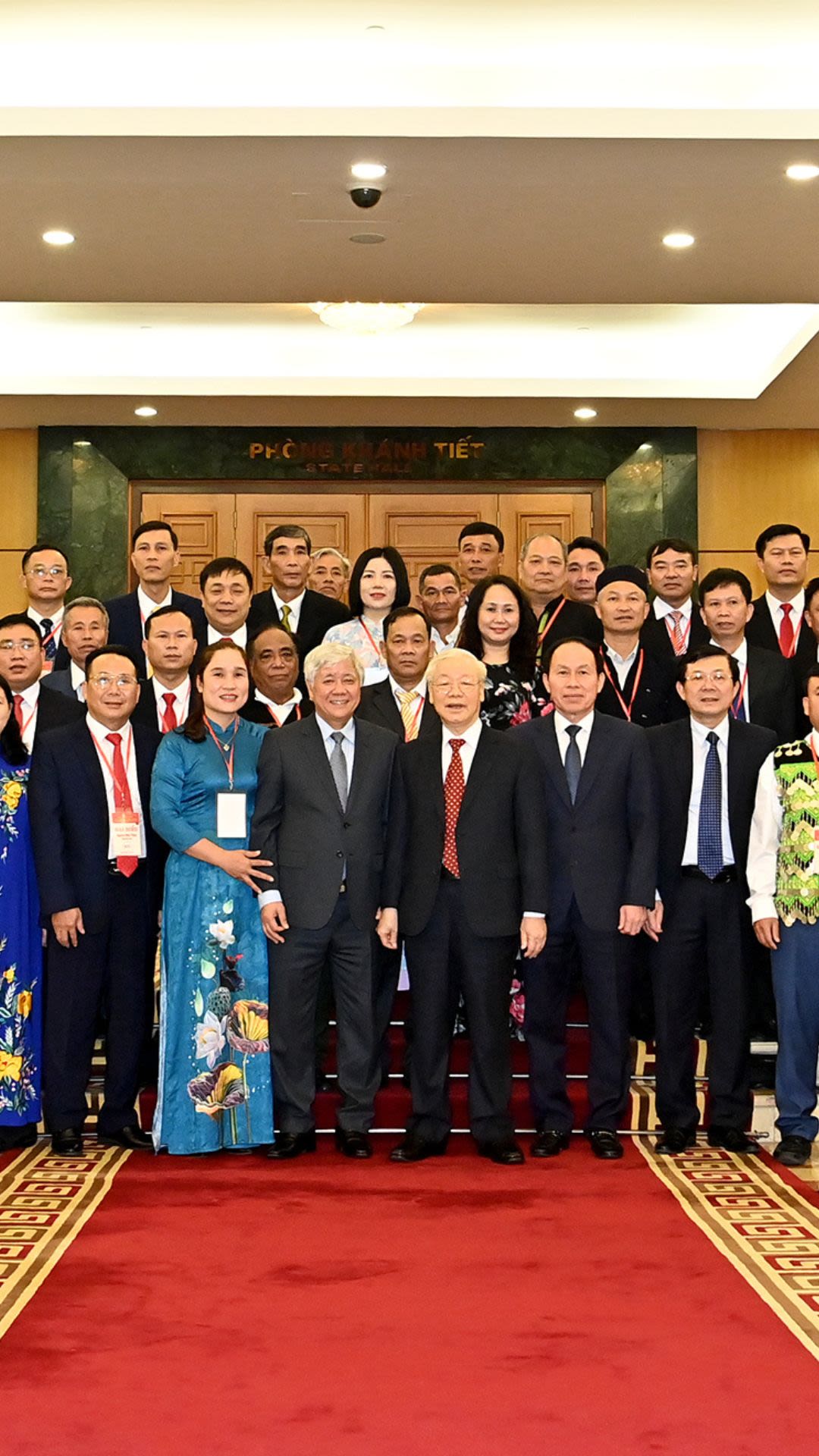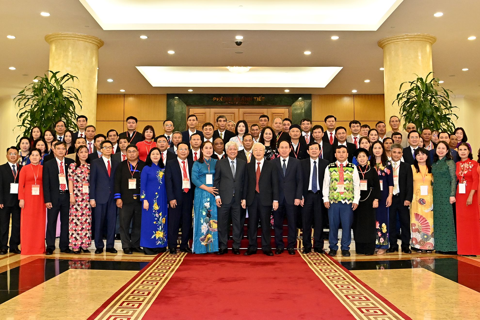 Tổng Bí thư Nguyễn Phú Trọng và các đại biểu đến dự buổi gặp mặt đại biểu dự Hội nghị biểu dương Chủ tịch Mặt trận Tổ quốc cấp xã và Trưởng ban Công tác Mặt trận tiêu biểu toàn quốc.