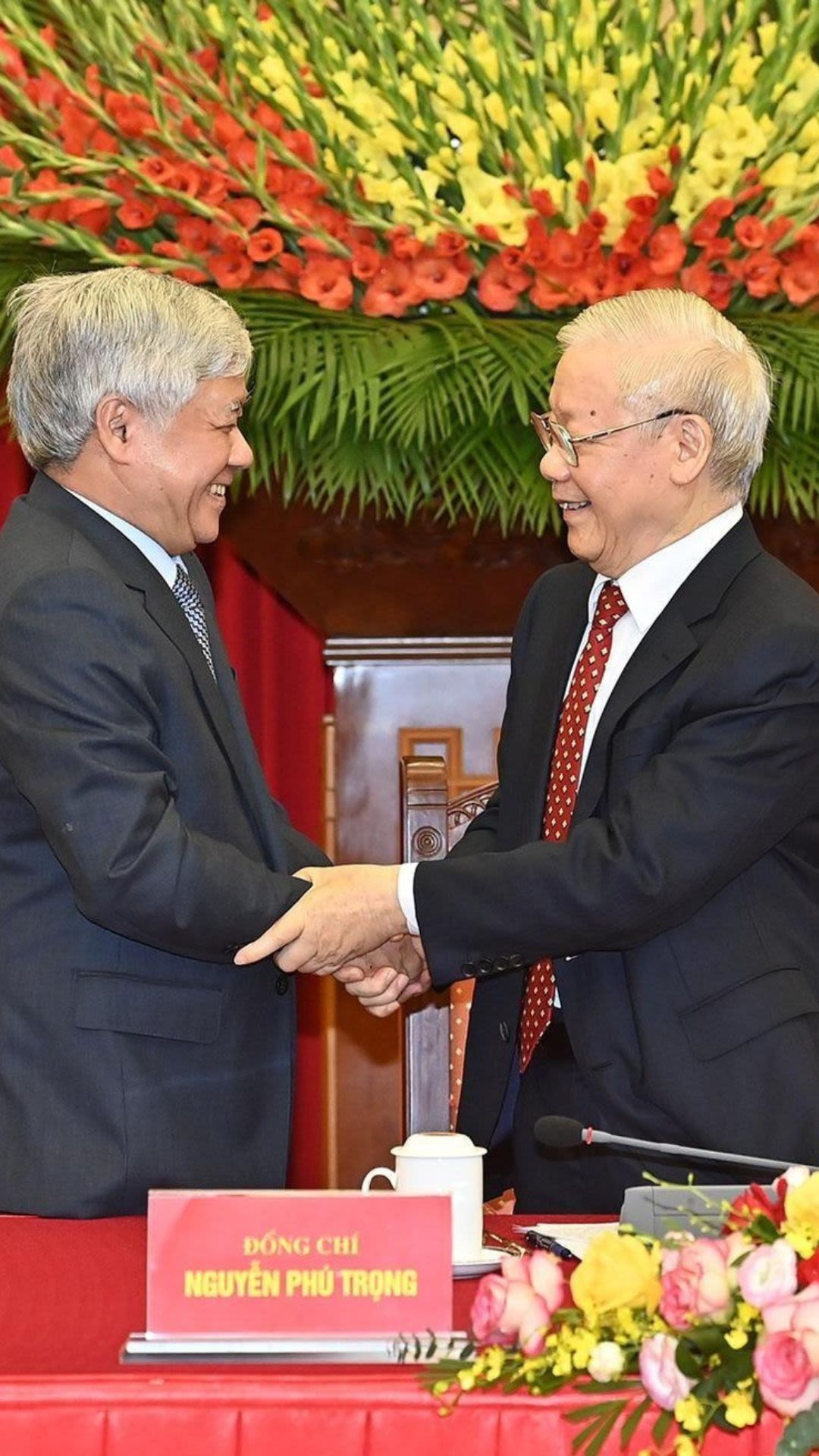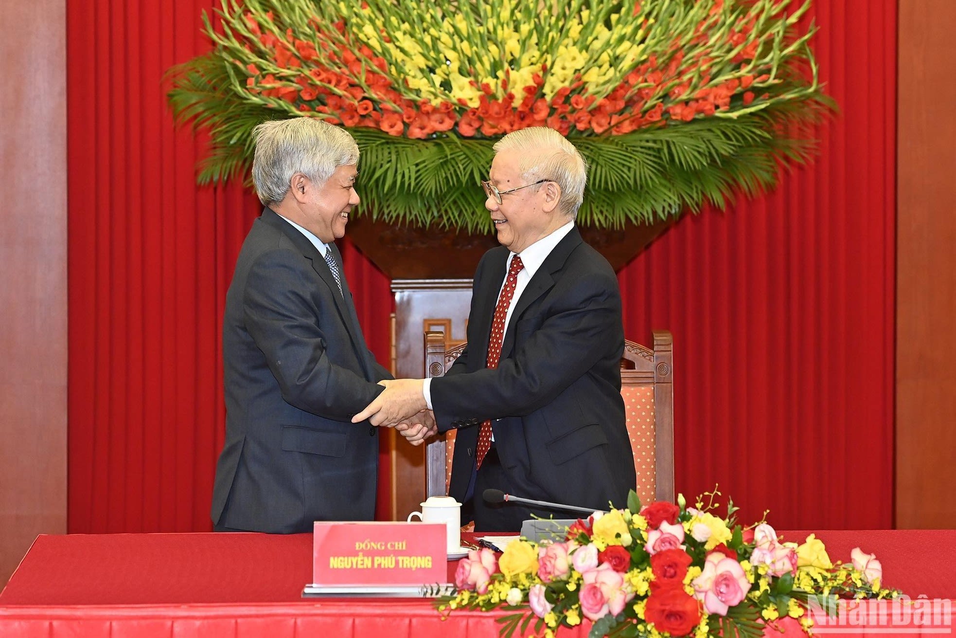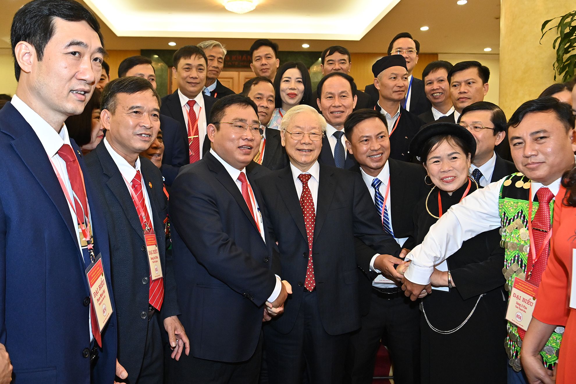Tổng Bí thư Nguyễn Phú Trọng và các đại biểu đến dự buổi gặp mặt đại biểu dự Hội nghị biểu dương Chủ tịch Mặt trận Tổ quốc cấp xã và Trưởng ban Công tác Mặt trận tiêu biểu toàn quốc.