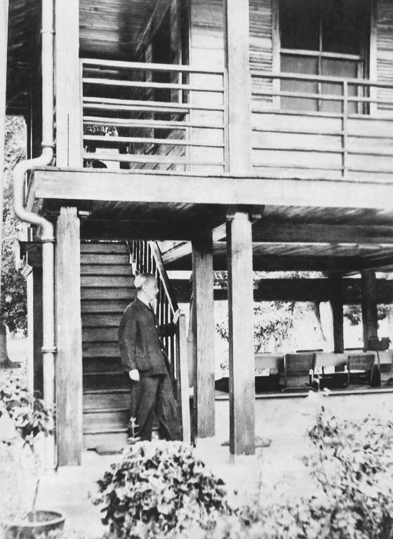Chủ tịch Hồ Chí Minh bên ngôi nhà sàn, nơi Người đã sống và làm việc từ năm 1958 đến năm 1969. Ảnh tư liệu