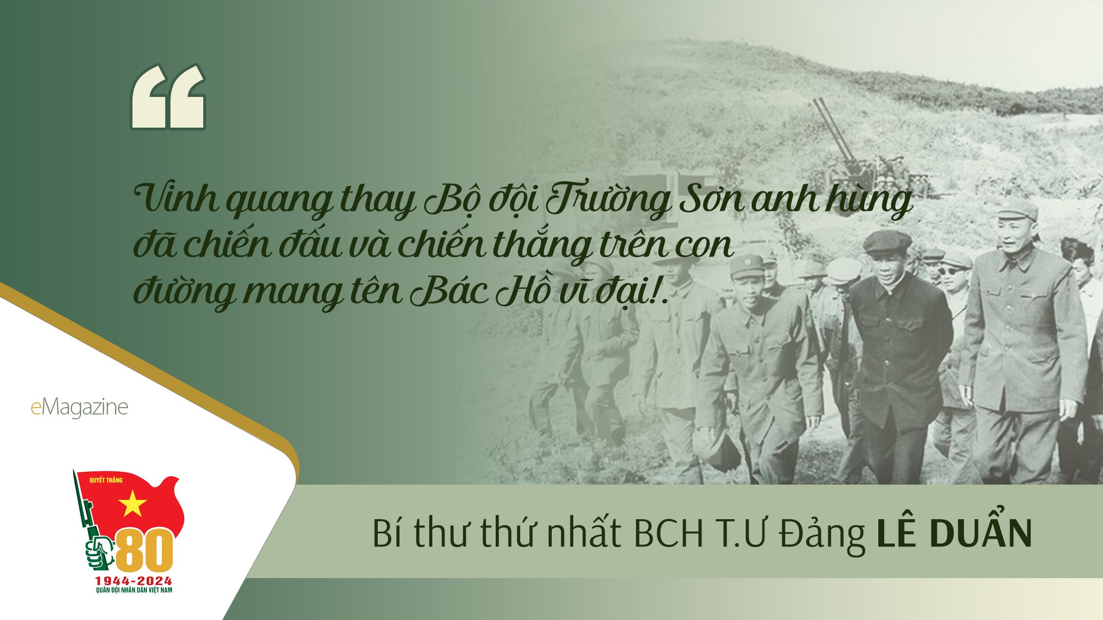 Năm 1973, trong dịp vào thăm và kiểm tra bộ đội đường Trường Sơn, đồng chí Lê Duẩn, Bí thư thứ nhất Ban Chấp hành T.Ư Đảng phát biểu: “Vinh quang thay Bộ đội Trường Sơn anh hùng đã chiến đấu và chiến thắng trên con đường mang tên Bác Hồ vĩ đại! Cán bộ, chiến sĩ Bộ đội Trường Sơn hãy phát huy truyền thống oanh liệt của quân đội ta để hoàn thành xuất sắc nhiệm vụ của con đường chiến lược vẻ vang này trong giai đoạn mới của cách mạng”.