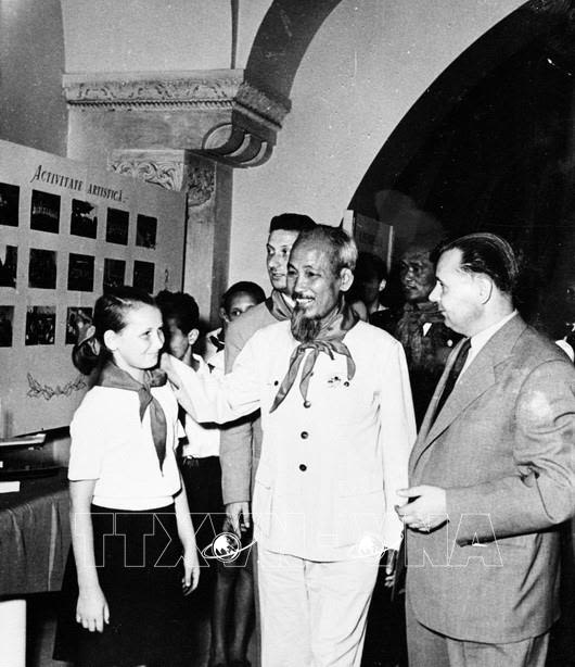 Thiếu nhi Romania đeo khăn quàng đỏ cho Chủ tịch Hồ Chí Minh khi Người đến thăm Cung thiếu nhi ở thủ đô Bucharest (8/1957). Ảnh: TTXVN