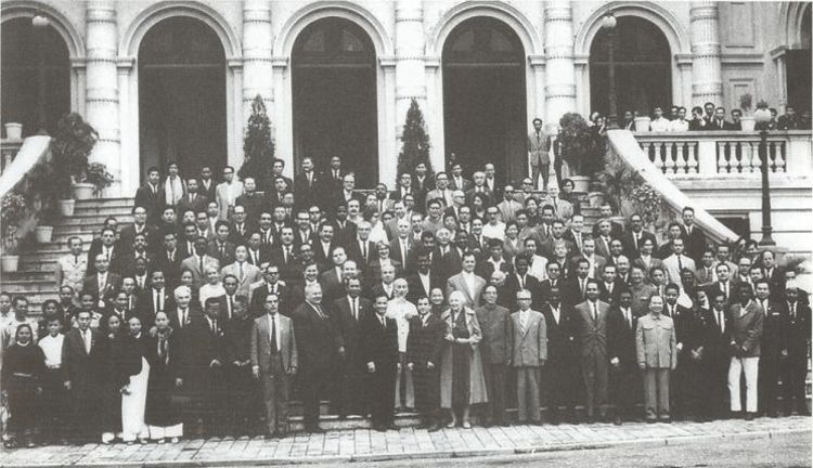 Chủ tịch Hồ Chí Minh chụp ảnh lưu niệm cùng các đại biểu tham dự Hội nghị quốc tế đoàn kết với nhân dân Việt Nam chống đế quốc Mỹ bảo vệ hòa bình tại Phủ Chủ tịch, tháng 11/1964. Nguồn: Khu di tích Hồ Chí Minh tại Phủ Chủ tịch
