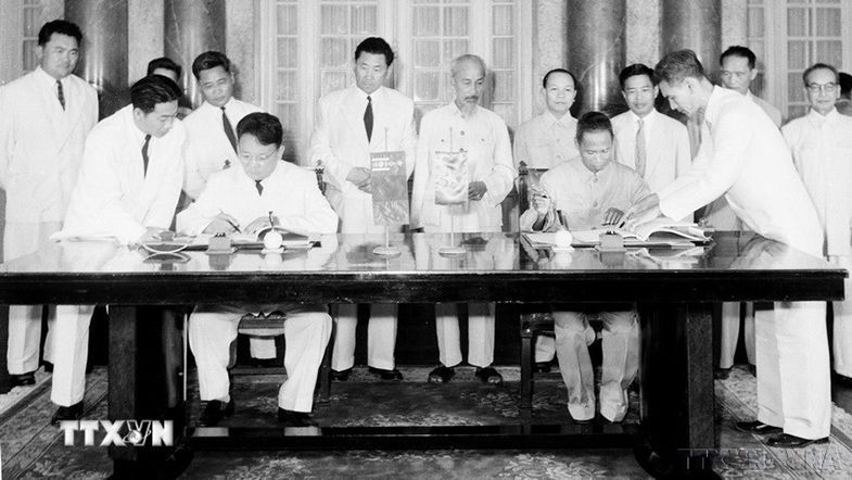 Ngày 6/9/1959, Chủ tịch Hồ Chí Minh chứng kiến lễ ký các văn kiện hữu nghị giữa Việt Nam và Mông Cổ. Ảnh: TTXVN