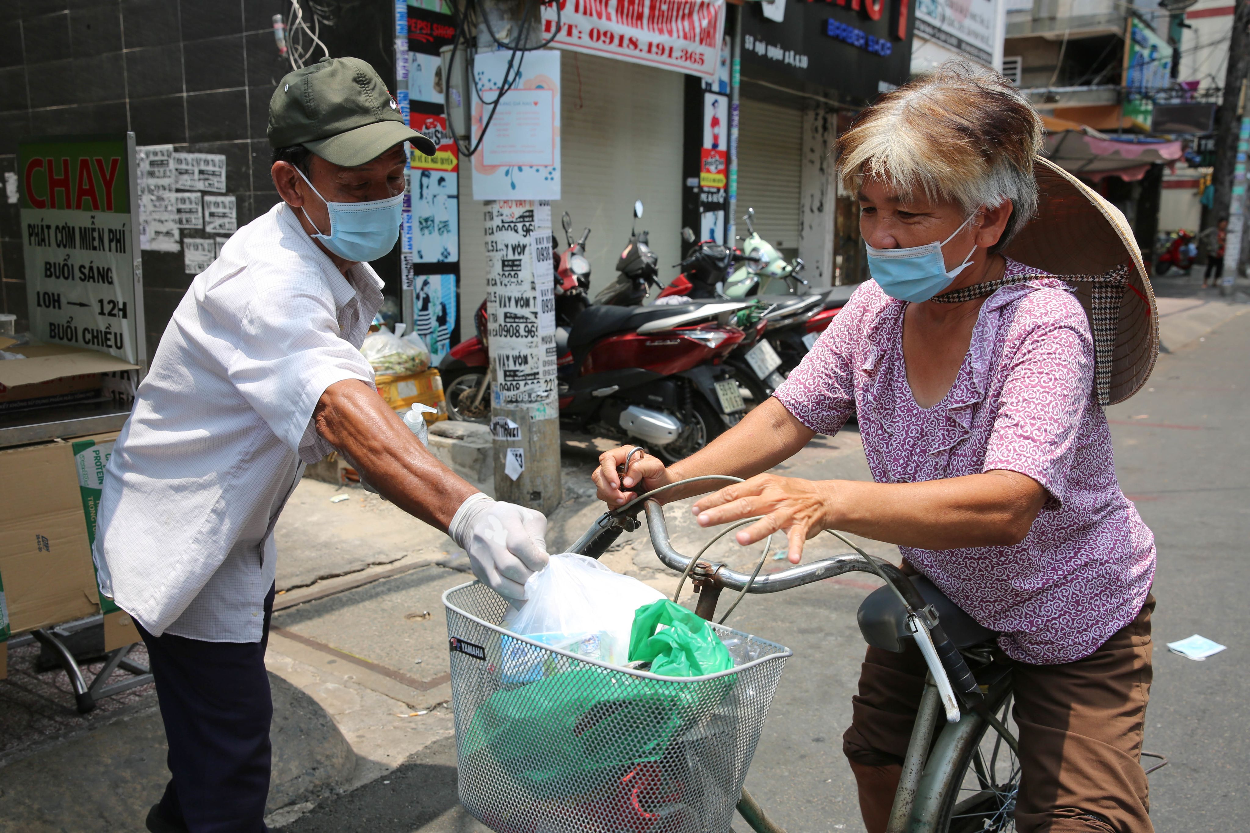 Phát cơm miễn phí cho người nghèo tại quán chay Bình An (phường 6, quận 10). Ảnh: HOÀNG TRIỀU
