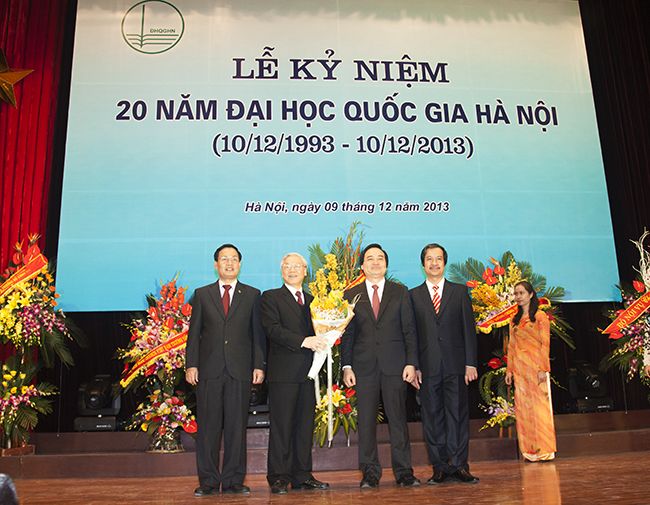 Tổng Bí thư Nguyễn Phú Trọng phát biểu tại buổi lễ kỷ niệm 20 năm thành lập ĐHQGHN (1993-2013), ngày 9/12/2013. Ảnh: VOV