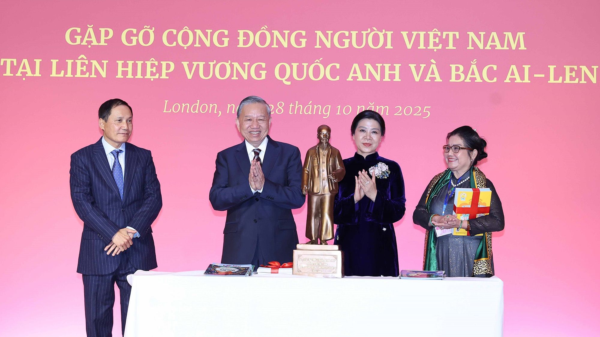 值此机会,苏林总书记与夫人吴芳璃向大使馆及旅英越南人社群赠送家乡纪念品,并向旅英儿童及越语课堂赠书,希望孩子们通过学习越语和了解越南悠久历史与灿烂文化,进一步增进对祖国的热爱与情感。
