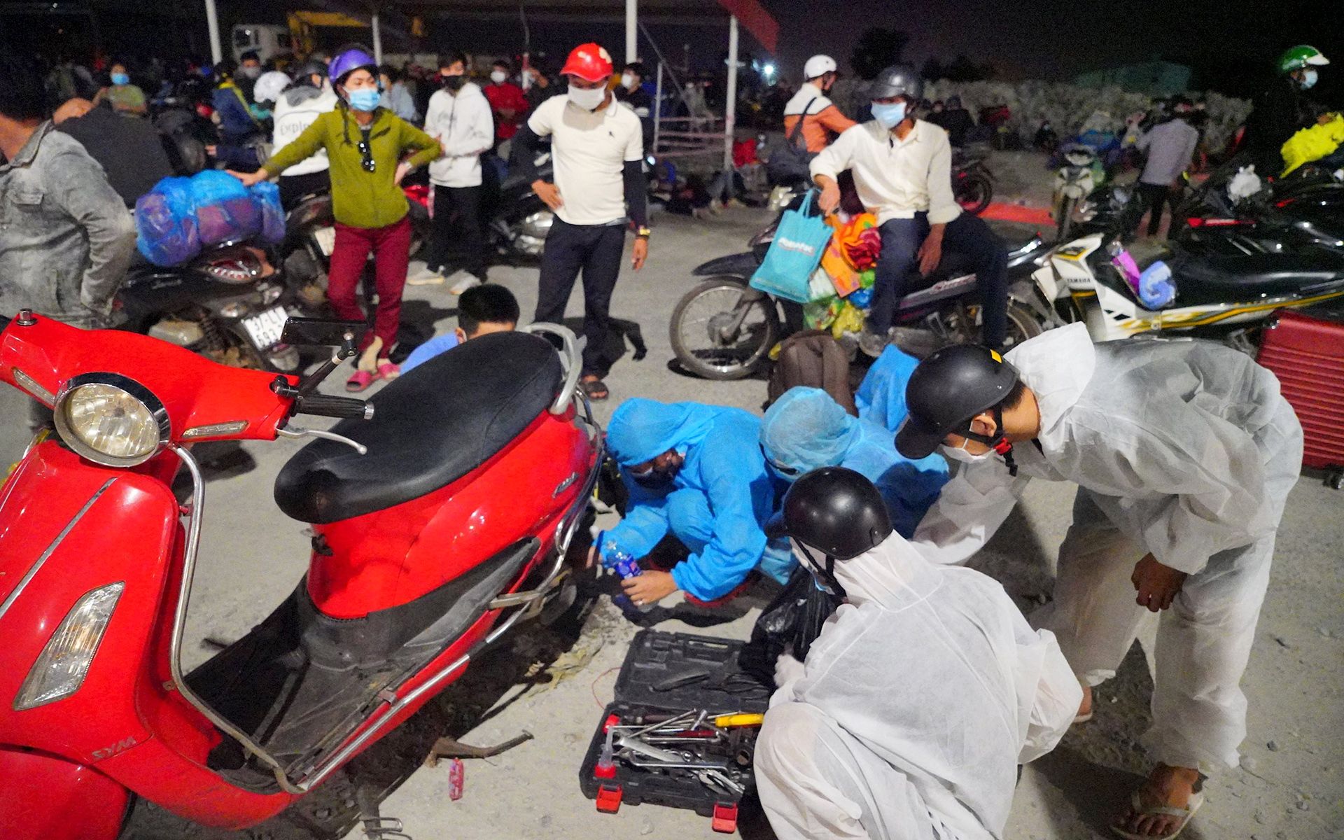 Đội sửa xe lưu động giúp bà con về quê tránh dịch Covid-19 do tác giả tổ chức.