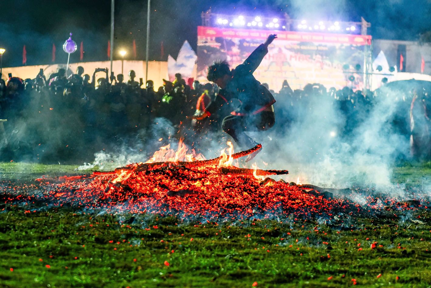 Cùng thời điểm đó, một đống lửa to được đốt giữa mảnh đất rộng tạo nên than hồng. Khi đống lửa đã cháy thành than rực hồng cùng với sự điều khiển của thầy cúng, các thành viên tham gia nhảy lửa lần lượt ngồi trước mặt thầy cúng, nhận sức mạnh và sự che chở của thần linh và tự nhảy vào than hồng nóng rực, đạp lửa bắn tung tóe mà không hề bị bỏng trong tiếng hò reo cổ vũ của mọi người.