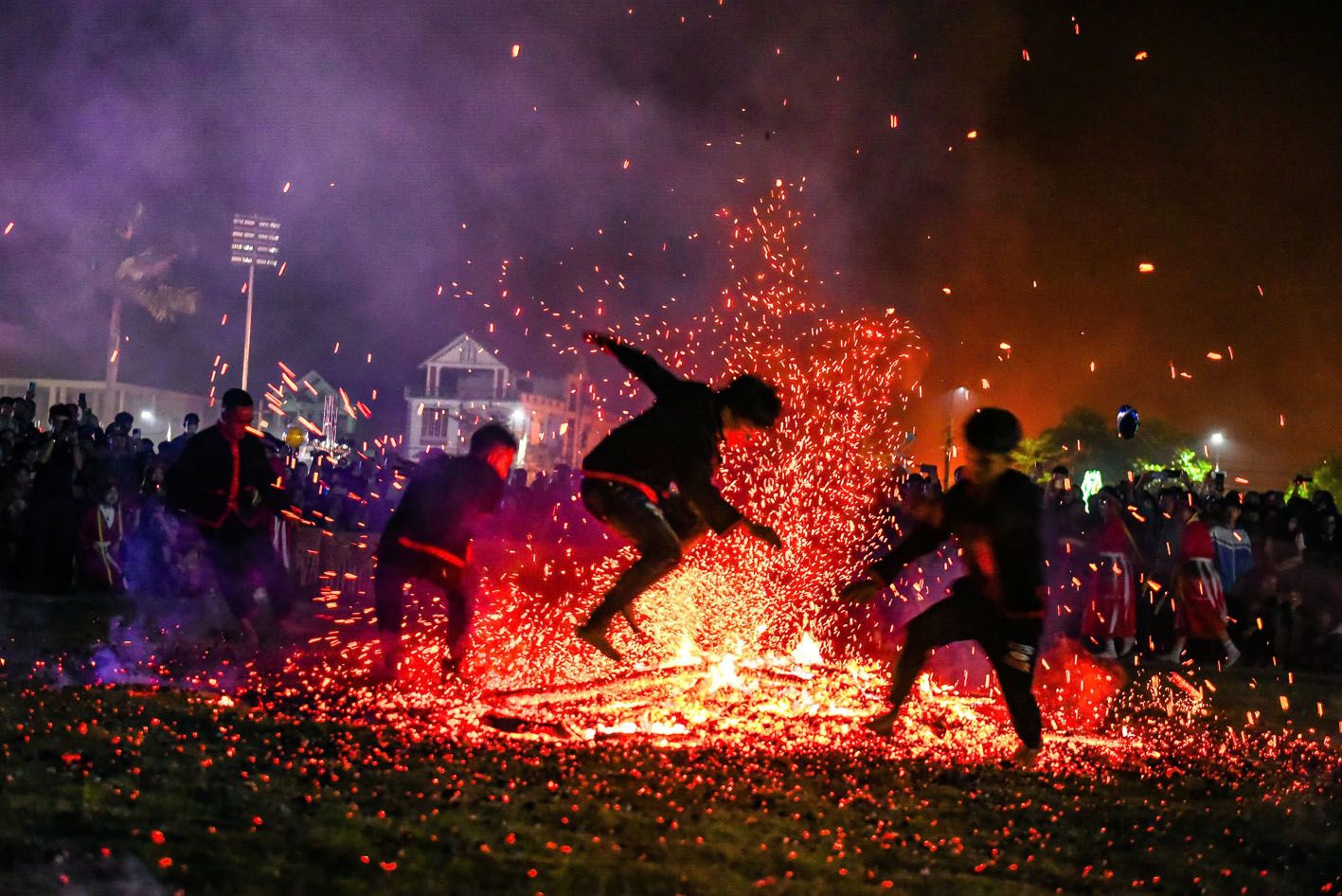 Đống lửa rực hồng, lần lượt từng thanh niên người Pà Thẻn ngồi trước thầy cúng để nhận sự che chở của thần linh, khi được thần linh chọn, người họ bật lên rồi lao ngay vào lửa.