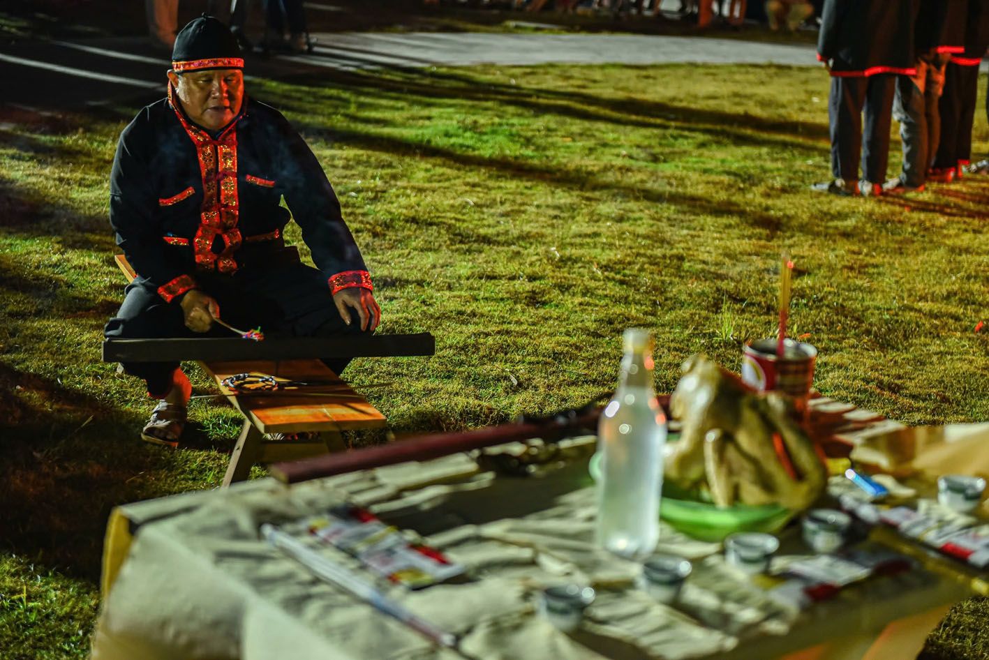 Nghệ nhân Xìn Văn Tu, thôn Mí Bắc, xã Tân Bắc, huyện Quang Bình làm lễ trước khi đám thanh niên người Pà Thẻn nhảy vào ngọn lửa thiêng.