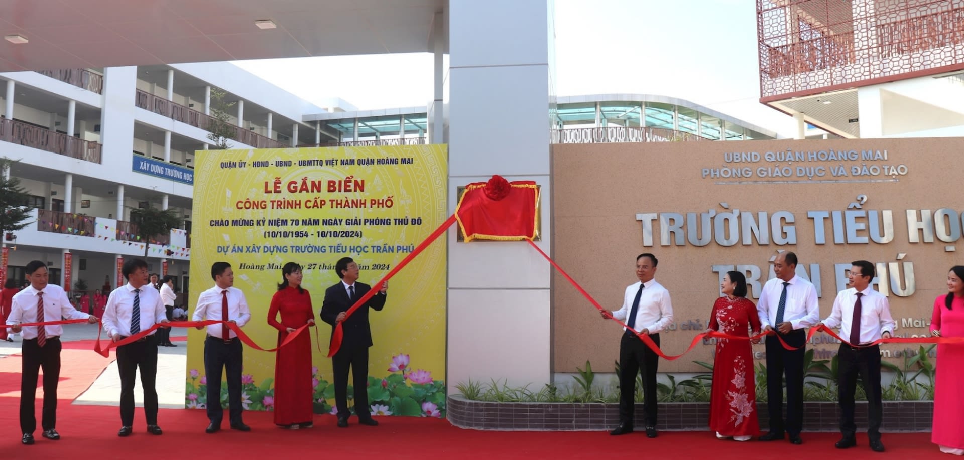 Quận Hoàng Mai tổ chức Lễ gắn biển công trình cấp thành phố chào mừng 70 năm Ngày Giải phóng Thủ đô (10/10/1954-10/10/2024) đối với dự án xây dựng Trường Tiểu học Trần Phú. Ảnh: HIỀN THU