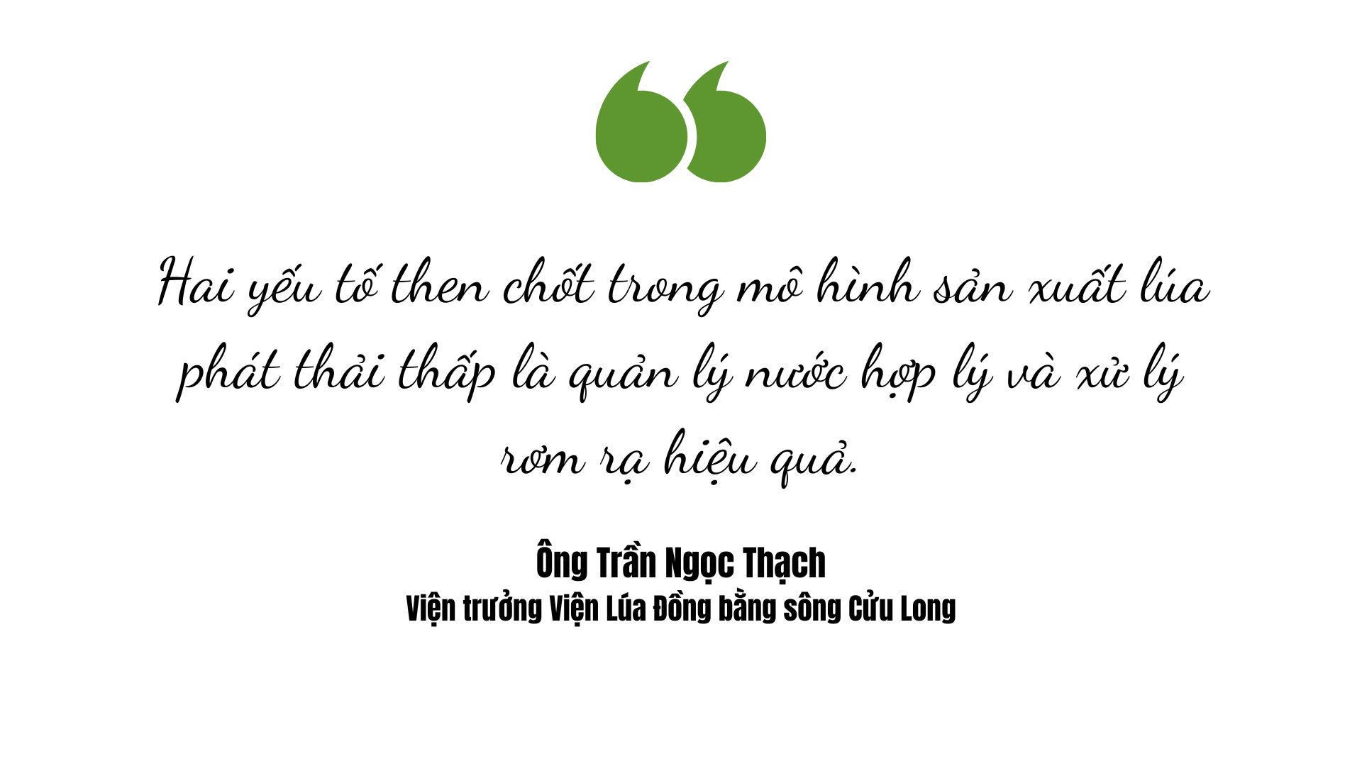 Theo ông Trần Ngọc Thạch, Viện trưởng Viện Lúa Đồng bằng sông Cửu Long, hai yếu tố then chốt trong mô hình sản xuất lúa phát thải thấp là quản lý nước hợp lý và xử lý rơm rạ hiệu quả. Tuy nhiên, hiệu quả triển khai phụ thuộc lớn vào điều kiện hạ tầng thủy lợi và địa hình canh tác. Tại các khu vực có hệ thống thủy lợi hoàn chỉnh, mô hình phát huy rõ hiệu quả; trong khi ở những vùng địa hình phức tạp, ruộng manh mún, việc triển khai gặp nhiều khó khăn.
