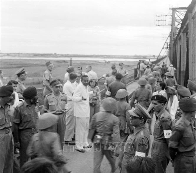 Một đơn vị bộ đội ta qua cầu Long Biên vào tiếp quản Hà Nội trước sự chứng kiến của đoàn Ủy ban quốc tế thi hành Hiệp định Geneva và quan sát viên quốc tế, chiều 9/10/1954. (Ảnh: Tư liệu TTXVN)