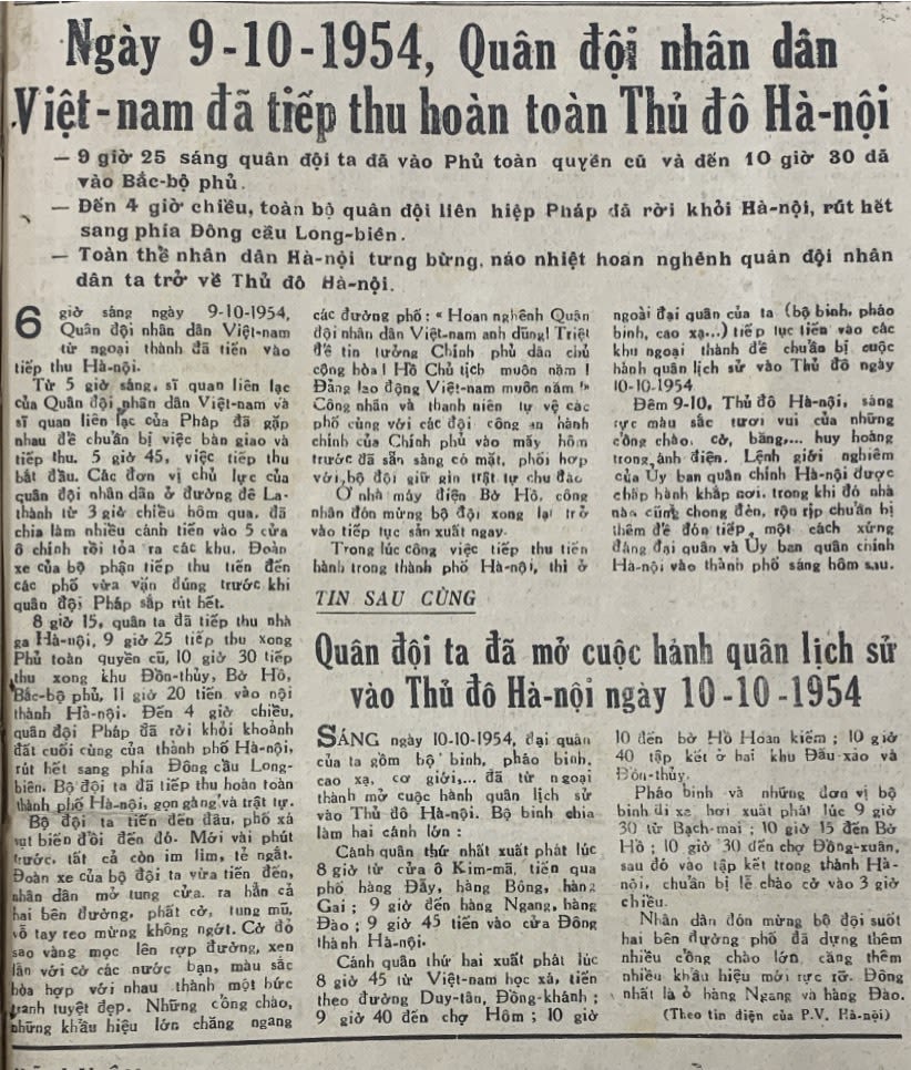 Trang nhất Báo Nhân Dân số ra ngày 11-12/10/1954 đã dành vị trí trang trọng nhất cho những dòng tin điện của phóng viên từ hiện trường: Ngày 9-10-1954, Quân đội nhân dân Việt Nam đã tiếp thu hoàn toàn Thủ đô Hà Nội.