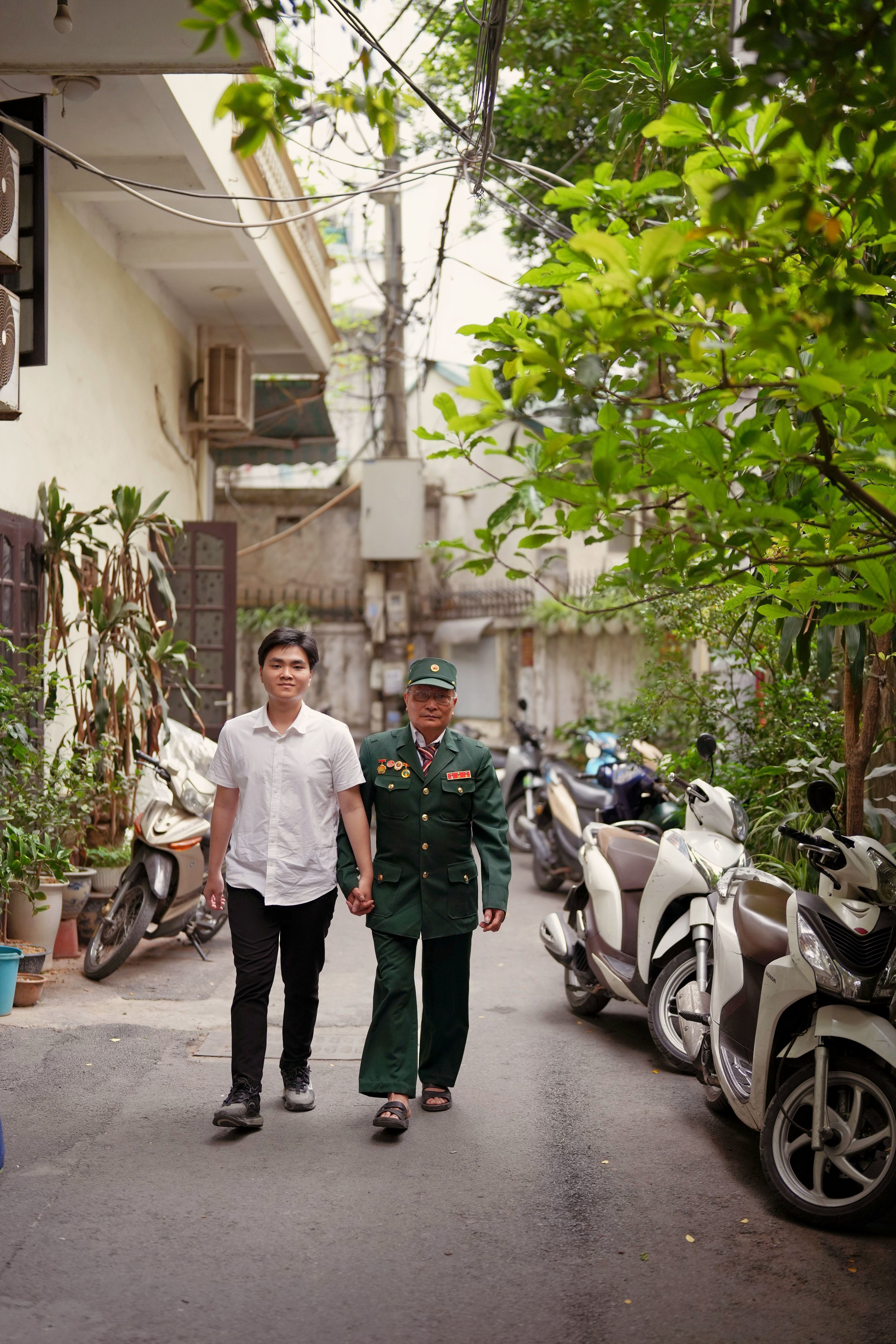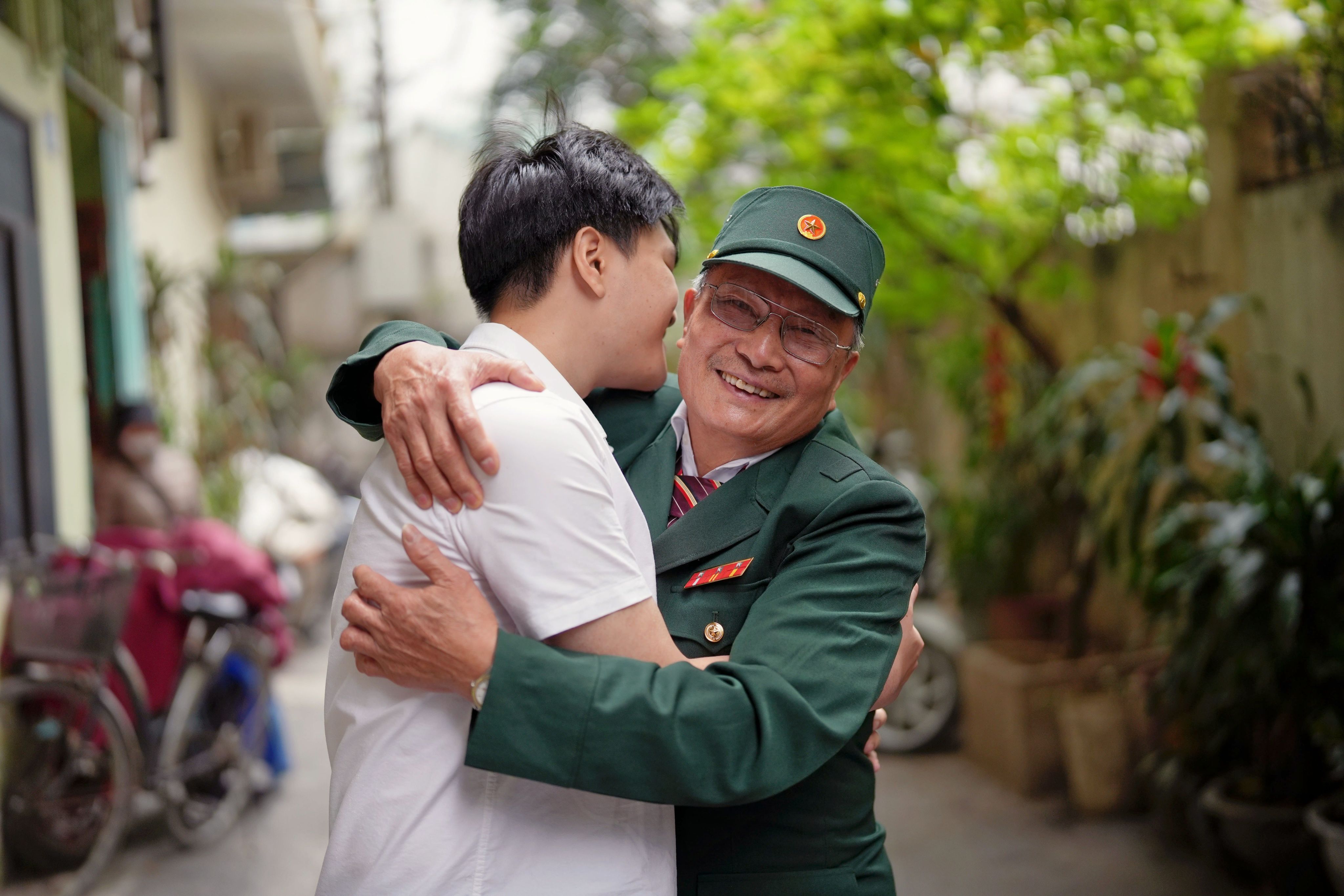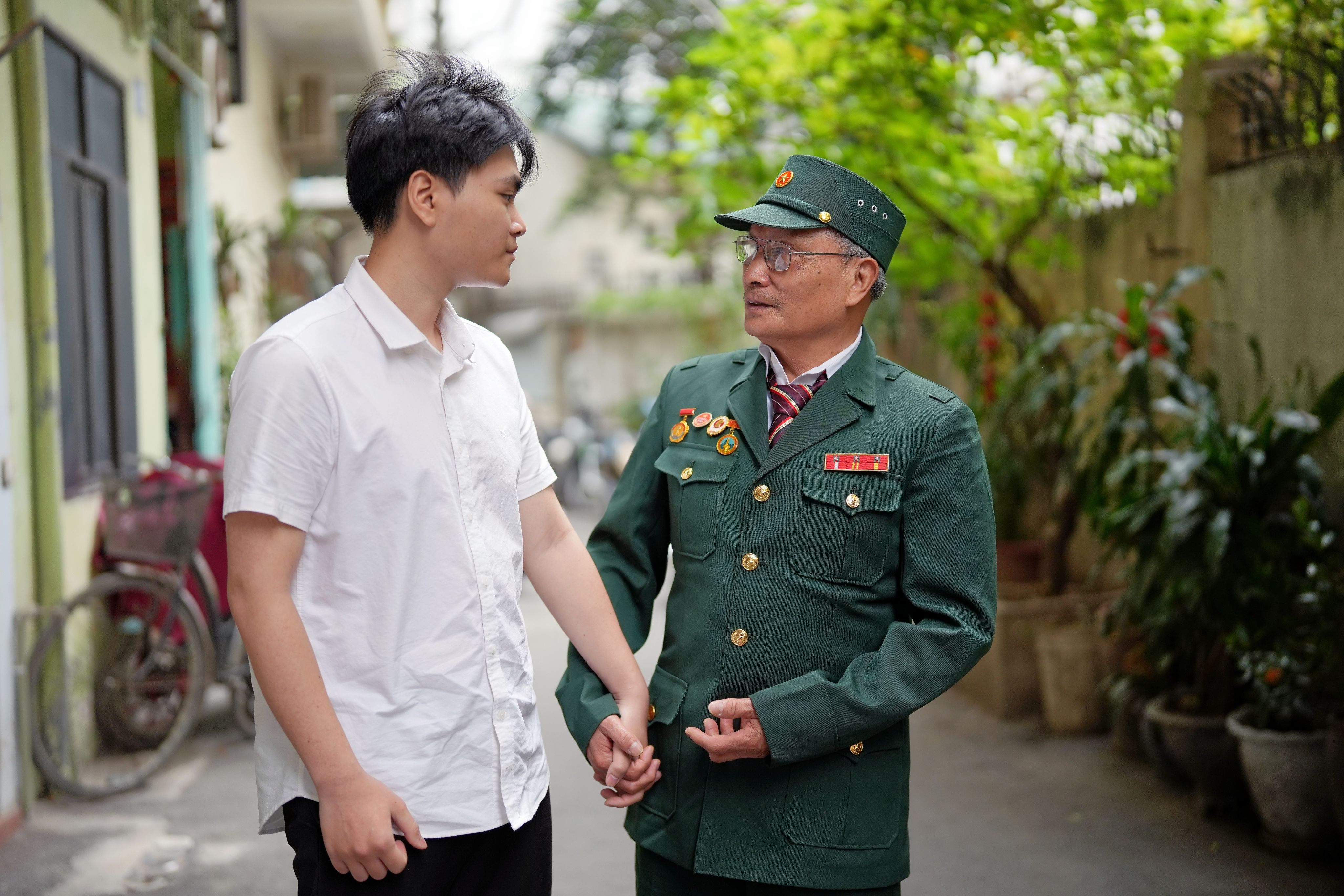 Hai ông cháu bước chậm trong con ngõ nhỏ, nắng tháng Tư rót vàng trên vai. Từng kỷ niệm cũ – những trận đánh, những cận kề sinh tử, cả những nỗi day dứt không lời – lặng lẽ hiện về, như thể mỗi bước chân là một trang sử đang mở ra trước mắt.